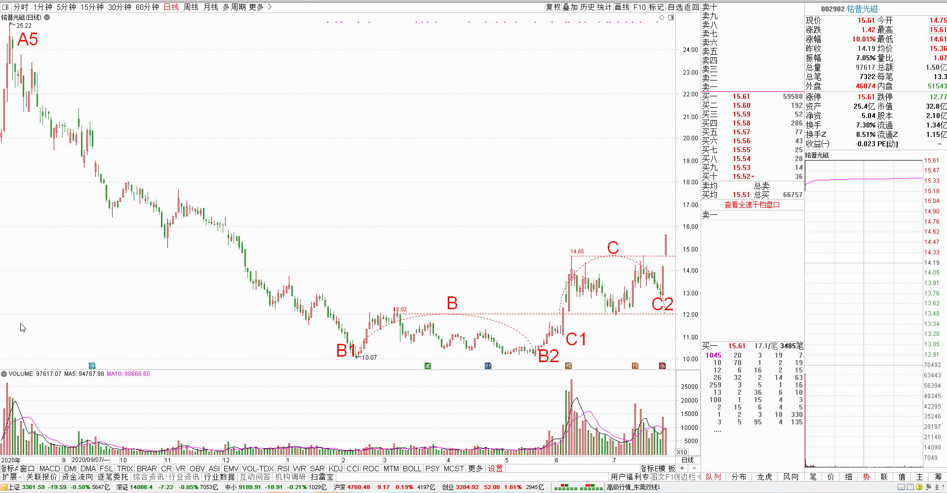 首先,无论从2017年上市后的顶峰60.77算起,还是从2019年0605的主峰43.44算起,当它跌到脚下B1左拐10.07的时候,最大跌幅都达到了5580的标准,巨跌之下,必有强反,所以它有资本走出一波强悍的反弹行情。