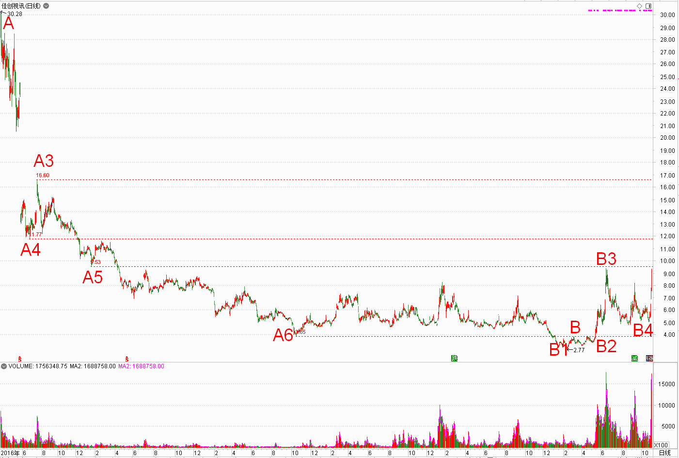 佳创视讯是老兵帅克今年6月份讲基因桥战法时的一只案例,当初该股强势拉到A3峰后虽然出现了回踩,但几经震荡之后,却在B4之后借助元宇宙再度爆发,3天拉出3个20%的涨停,相当于注册制股票的3天6板,成为元宇宙的一只新龙头。