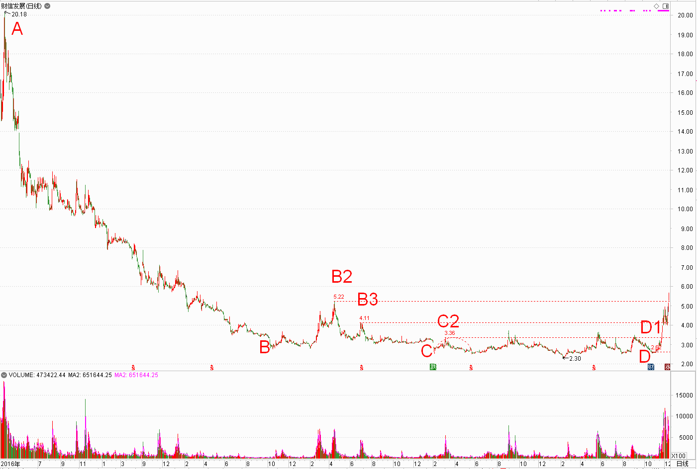 2、基础好。它的股价跌到B柱之后,上下震荡长达三年,但却始终有效守住B底不破,最终在D柱附近形成三叉戟掉头,并且连板突破主升启动线A2线。这说明它的基础相当好,走主升浪的概率大大增强,后市值得我们期待。