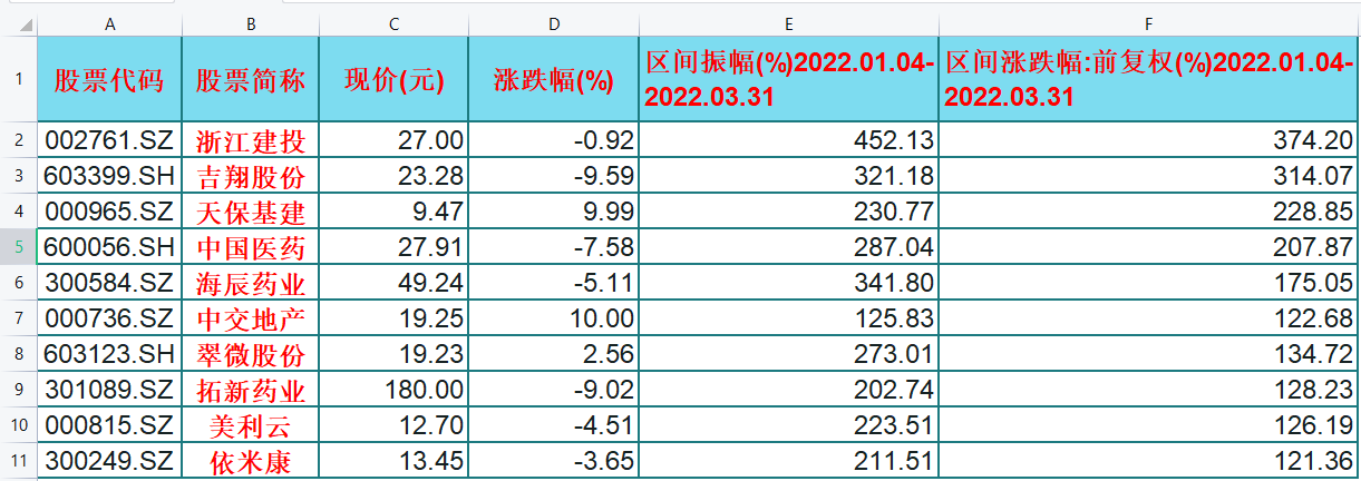 4月10号,我们利用同花顺问财软件,选出了2022年第一季度的十大牛股:浙江建投、拓新药业、天保基建、中国医药、依米康、翠微股份、中交地产、吉翔股份、海辰药业和美利云。