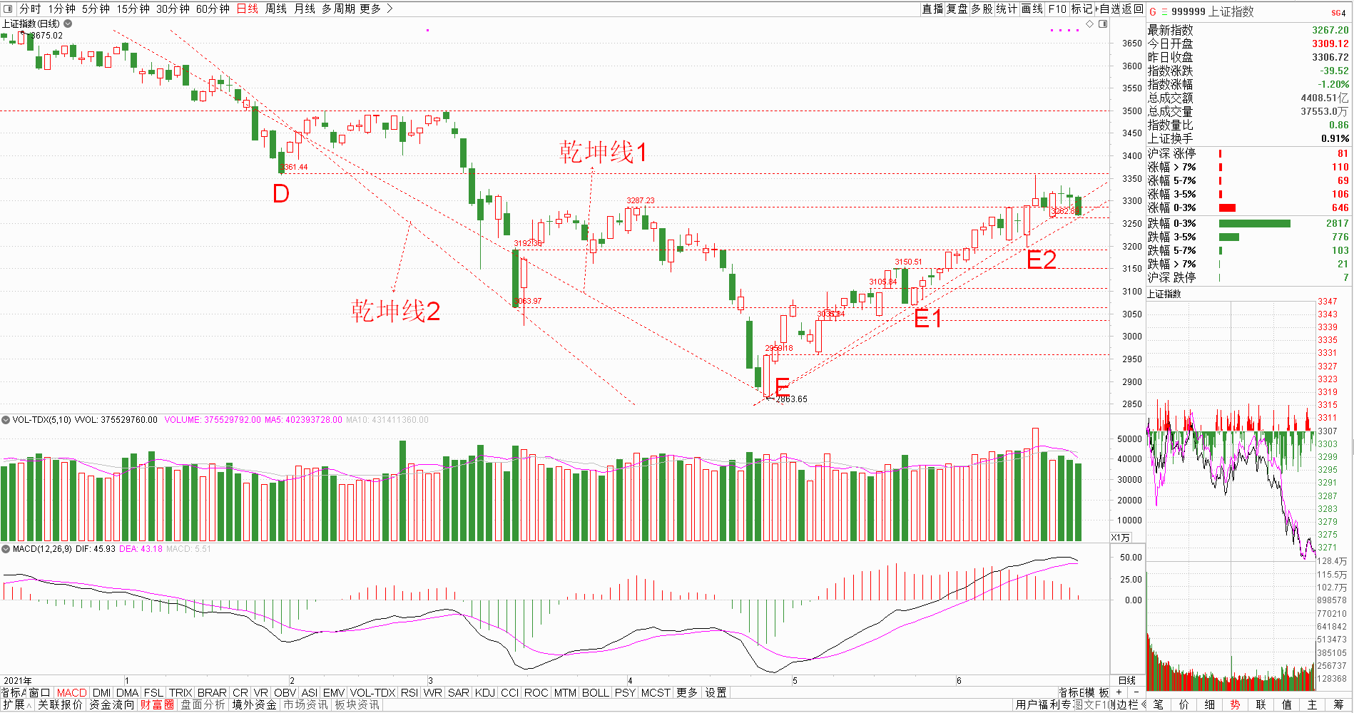 在之前的收评里,老兵帅克多次说过大盘只要能有效守住E-E1烽火线不破、特别是要能有效守住E-E1烽火线跟3282构成的烽火叉不破,后面就会继续上涨,但要是无法有效守住,后面就会出现震荡。