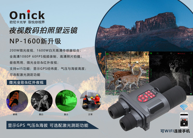 欧尼卡NP-1600红外夜视数码望远镜采用优异的光学、电子、机械系统融合设计,具有清晰的物镜成像,稳定的电子功能及舒适的目镜成像。同时具备夜视与白天的望远功能,尤其是其微光全彩夜视功能,性能出众,可在观看远处物体的同时,进行拍照、录像,记录精彩的瞬间。NP-1600是一款同时集成图像传输,GPS,电子罗盘传感器,角度传感器,海拔气压传感器等多功能一体的智能数字双筒数字望远镜。