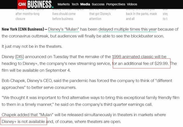 今年开始,大部头的网络公映,开始逐渐形成规模,不过看到《花木兰》在迪士尼的流媒体平台Disney+上29.9美元的票价,也是深刻感受到我们的幸福,这个价格,够我们进十次影院了,而我们在网络看一部大片,多是免费,即便收费,也不过是10块左右。