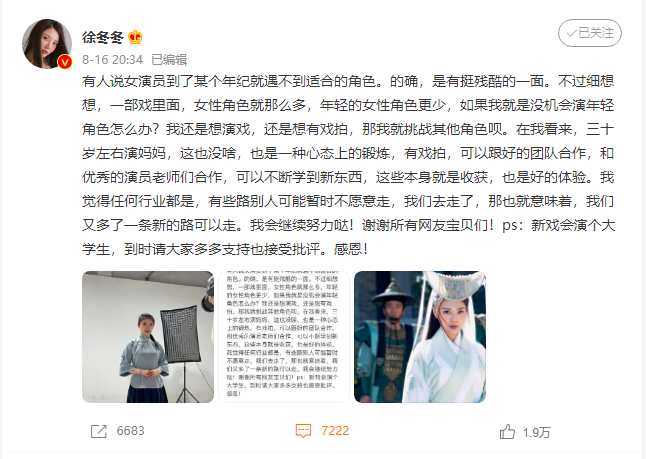 相信在表演战线上从来无所畏惧的徐冬冬,未来还可以挑战更多超乎想象的角色,这是对自我的考验,也是对观众的回馈,而她微博也预告了自己“新戏会演个大学生”,又是角色间跳跃式的年龄差,我们可以从现在开始期待起来了。