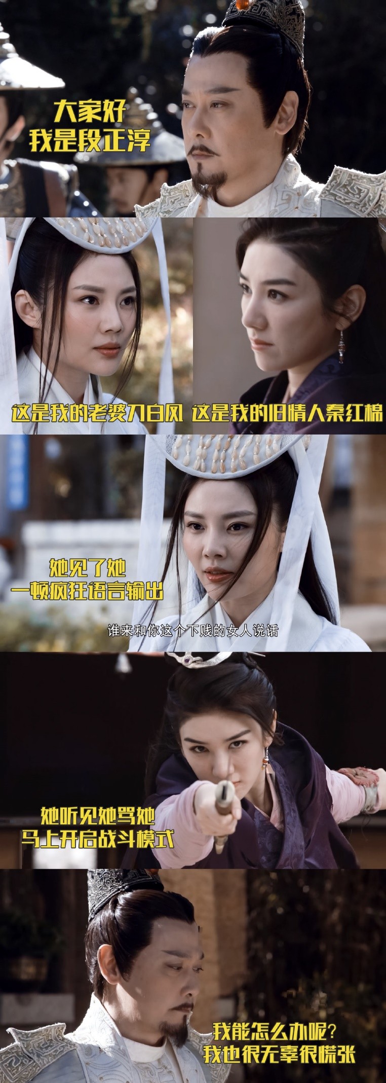 后面的剧情,刀白凤跟随段誉回到王府,在丈夫段正淳的声声“凤凰儿”的呼唤下,也有了些许的娇羞,只可惜这夫妻相处的时间太短,丈夫当年四处留情的两位红颜知己——秦红棉和甘宝宝陆续来到王府,本想心静如水的刀白凤,无奈又卷入万丈红尘的痴怨之中。在这部分剧情中,由徐冬冬饰演的刀白凤,与黄奕饰演的修罗刀秦红棉,也有许多的对手戏,毕竟新怨旧恨中的她们似仇人相见,两人不仅在剧情中爆发了冲突,而且对于两位演员而言,这也是实力相当的飙戏大战,让人看得十分过瘾。