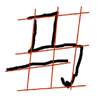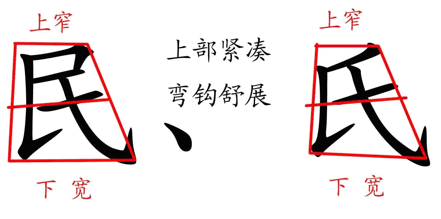 上部窄、下部宽,呈梯形。上部笔画比较紧凑、下部的弯钩写得比较舒展。如图