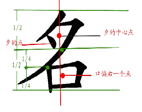 名字最容易写歪。下面口在名的中心线偏右一点点,夕的点的下部大约在长撇的1/2处(或偏上),口的位置在撇下半部的1/2处,整个字形偏长。