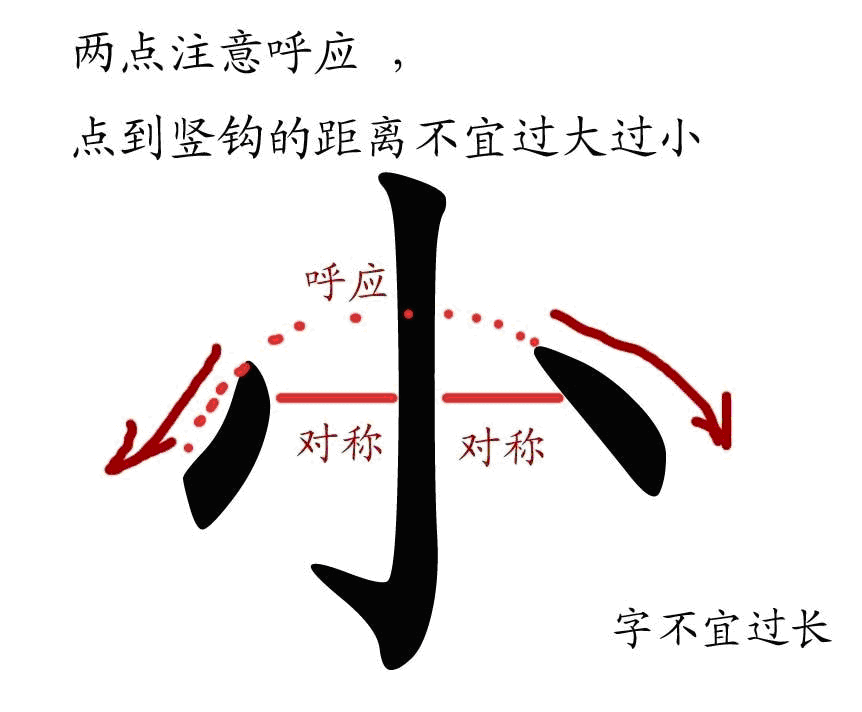 小字注意两点是呈呼应状态,如果是行书的画中间是有若连若断的弧线的,写楷书要注意这一点;左点写时从右向左下写,右点从左向右下写;两点距离竖钩不宜太近、也不能太远,太远字则散,太近字则拘谨;两点在竖钩的中部为好,点不宜写得过小,两边都要写成长点。竖画不能写得过长,整个字外框呈方形。