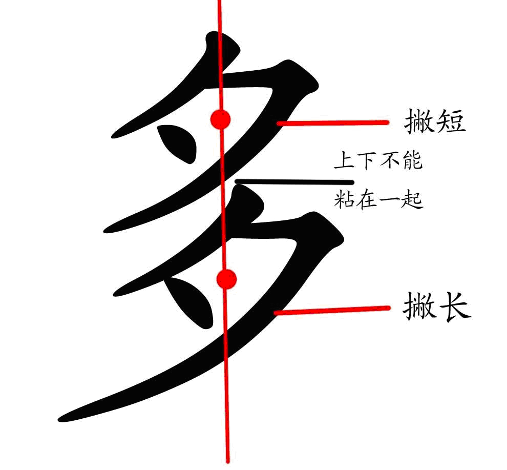 多字的两个夕字,上面的夕字撇短,下面的夕字撇长,下面的撇支撑整个字的中心;最难是上下两个字重叠的位置,两个夕字的中心点大约在同一条中轴线上,上下要留下一定距离,不能粘字一起。