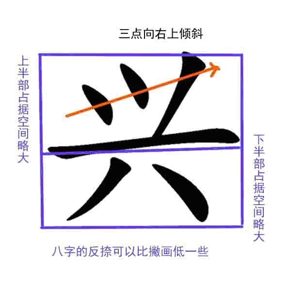 兴的写法注意上面三点沿势向右上方倾斜,中间点最高。上部三点占据的空间比下面的八字占据的空间略大,点距离横一定距离。学字头的三点写法和兴的三点写法类似。