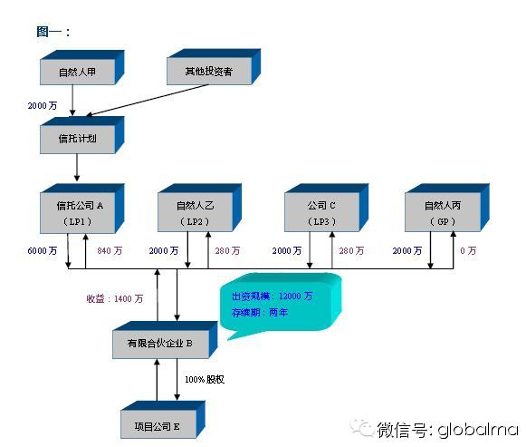 信托公司A设立X集合资金信托计划,信托计划规模为6000万元人民币,自然人甲出资2000万元认购信托计划的信托单位,甲认购的信托受益权的预期年化收益率为9%。A作为LP以信托计划募集资金向有限合伙企业B出资。B的认缴出资总额为12000万元人民币,其中A作为LP1货币出资6000万元,自然人乙作为LP2货币出资2000万元,公司C作为LP3货币出资2000万元,自然人丙作为GP货币出资2000万元。B对房地产项目公司E进行股权投资,并持有E的全部股权,B存续期为两年(结构图见图一)。