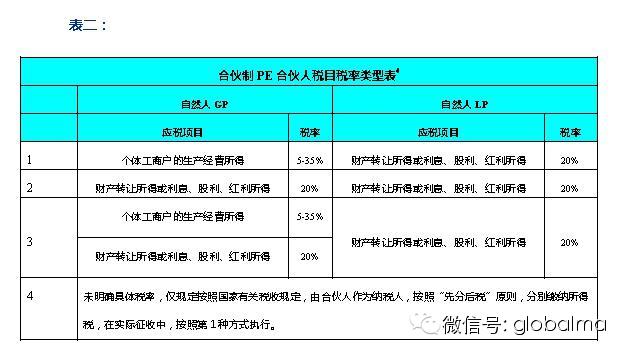 2008年以来,针对股权投资企业及股权投资管理企业的登记管理及税收政策的地方性文件纷纷出台,其中大都包含合伙制PE所得税处理的相关规定。但已经出台PE地方政策的城市或地区在参照全国性的法律法规规章和政策文件制订地方性的PE管理政策时,一般只是在按照“先分后税”的原则的基础上增加了区分自然人担任普通合伙人和有限合伙人的情形,如上海规定,执行有限合伙企业合伙事务的自然人普通合伙人,按照《中华人民共和国个人所得税法》及其实施条例的规定,按“个体工商户的生产经营所得”应税项目,适用5%-35%的五级超额累进税率,计算征收个人所得税。不执行有限合伙企业合伙事务的自然人有限合伙人,其从有限合伙企业取得的股权投资收益,按照《中华人民共和国个人所得税法》及其实施条例的规定,按“利息、股息、红利所得”应税项目,依20%税率计算缴纳个人所得税;新疆维吾尔自治区则规定,合伙制股权投资类企业的合伙人为自然人的,合伙人的投资收益,按照“利息、股息、红利所得”或者“财产转让所得”项目征收个人所得税,税率为20%。合伙人是法人或其他组织的,其投资收益按有关规定缴纳企业所得税。总体而言,从各地公开披露的政策文件来看,各地对合伙制PE的合伙人个人所得税税目及税率的规定大体分为四种类型(见表二《合伙制PE合伙人税目税率类型表》):