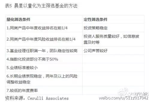 不同公司在定量和定性筛选方法上有所侧重,长期挑选管理人的经验也会形成一整套的方法和体系,我们以晨星和罗素为例来分析偏重定量和偏重定性的两种筛选方法。