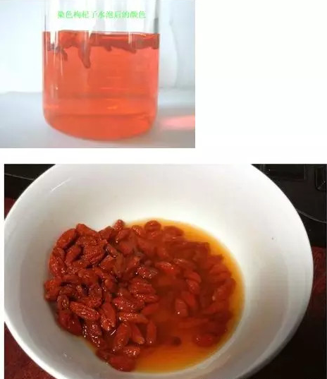 3、泡水的自然枸杞水色为透明的黄色,染色枸杞水色呈红色且浑浊。