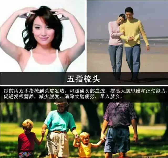 头部穴位多,通过梳理,可起到按摩、刺激作用。睡前用双手指梳到头皮发热,可疏通头部血流,提高大脑思维和记忆能力,促进发根营养,减少脱发,消除大脑疲劳,早入梦乡。