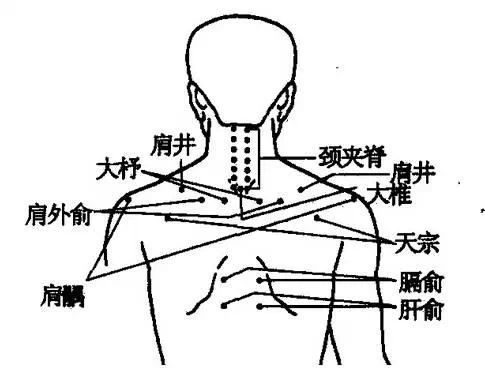 用闪火法(将点燃的酒精棉球,伸到罐内烧一下,抽出棉球,很快罩扣于患处皮肤上。)将罐吸附于大椎、大杼、肩井、肩髃、天宗、膈腧、肝俞,亦可用抽气罐法吸附于上述穴位,留罐10~15分钟,每日1次。