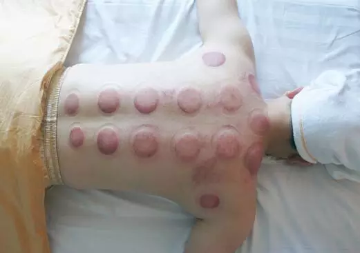 将加工成不同口径的竹管放在煮沸的药水(艾叶、防风、杜仲、麻黄、木瓜、川椒、穿山甲、土鳖虫、羌活、苍术、独活、苏木、红花、桃仁、透骨草、千年健、海桐皮各10克,乳香、没药各5克,布包水煎)锅内,2~3分钟后取出,并把管内药水甩净,迅速地放在患者穴位上,可牢固吸住皮肤。7~8分钟后取下,局部皮肤出现淤血或充血。据病情每日或隔日治疗1次,10次为1疗程。