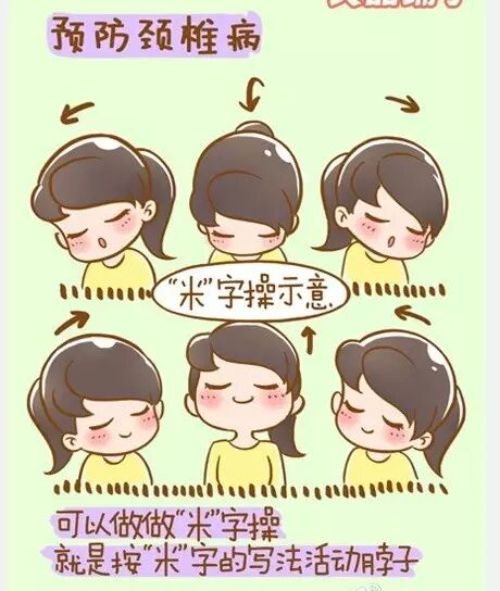 以头为"笔",按以下顺序反复书写"米"字:先写一横,头尽量由左到右画一横,头回到正位;再写一竖,头颈尽量向前上方拉伸,自上而下画一竖线,头回到正位;头颈尽量向左上方拉伸成45度角,头回到正位,同法书写米字右上点,头回正位,头颈尽量向右上方拉伸,向左下方画一撇,头颈回到正位;头尽量向 左前上方拉伸,向右下方画一捺,恢复头颈正位。动作宜柔和,切忌用力过猛,每日做1~2次,以感觉头、颈、肩轻快和舒适为度。