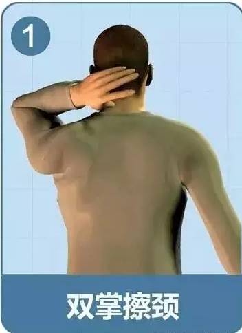 1、双掌擦颈: 用左手掌来回摩擦颈部,口中默念8下后,开始捏后颈。然后换右手。有助于颈部放松。