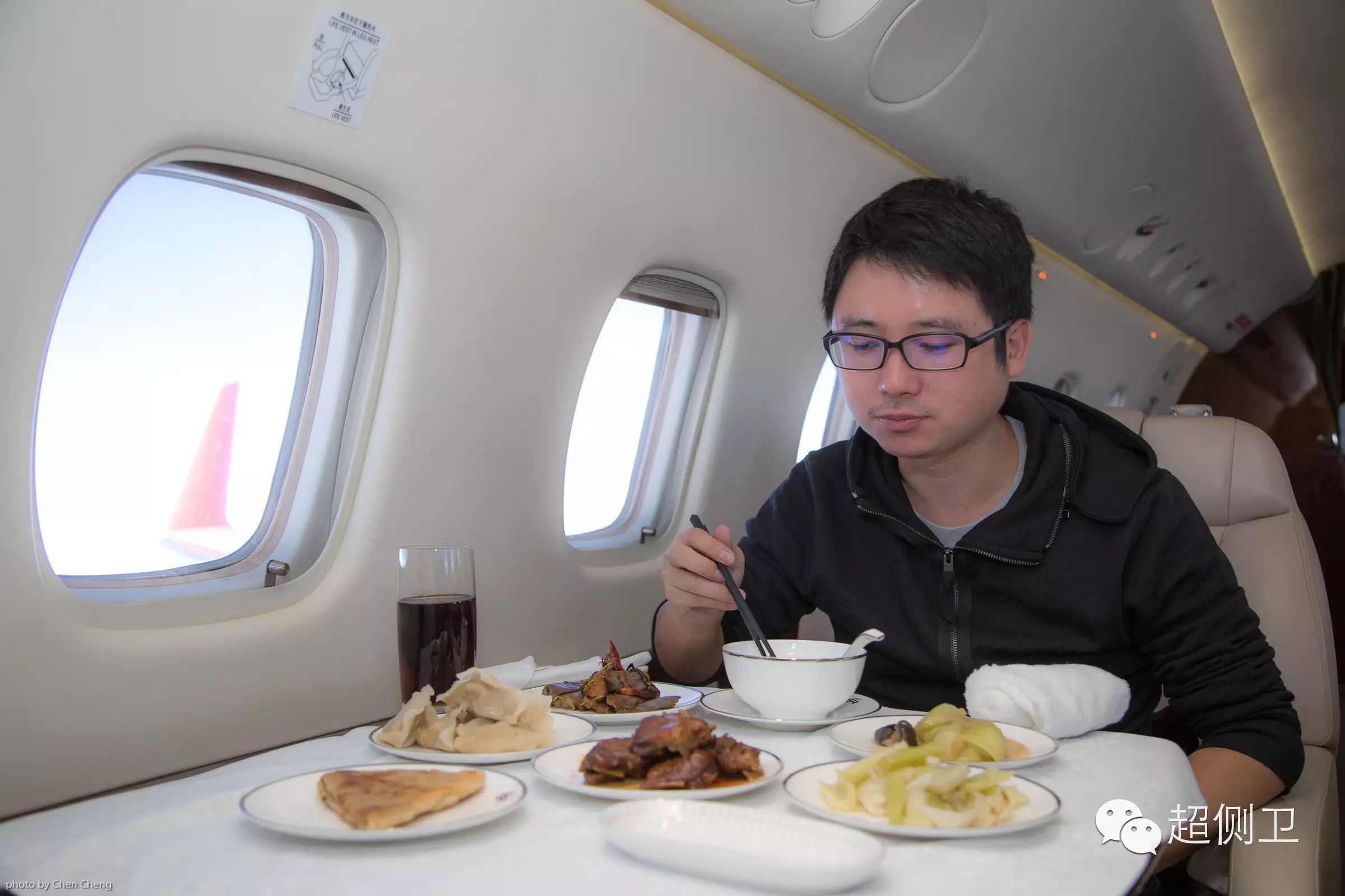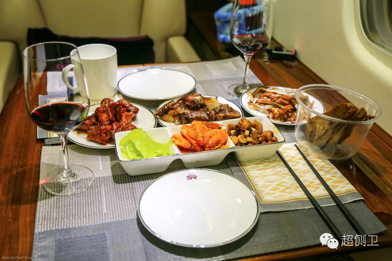 起飞之后的晚餐:大虾、猪耳朵、果仁、香辣翅、莴笋。这些都是计先生自己的餐厅“渝麻渝辣”提供的,食材也都是从重庆空运过来的。只差架起火锅,边涮边飞美国了。