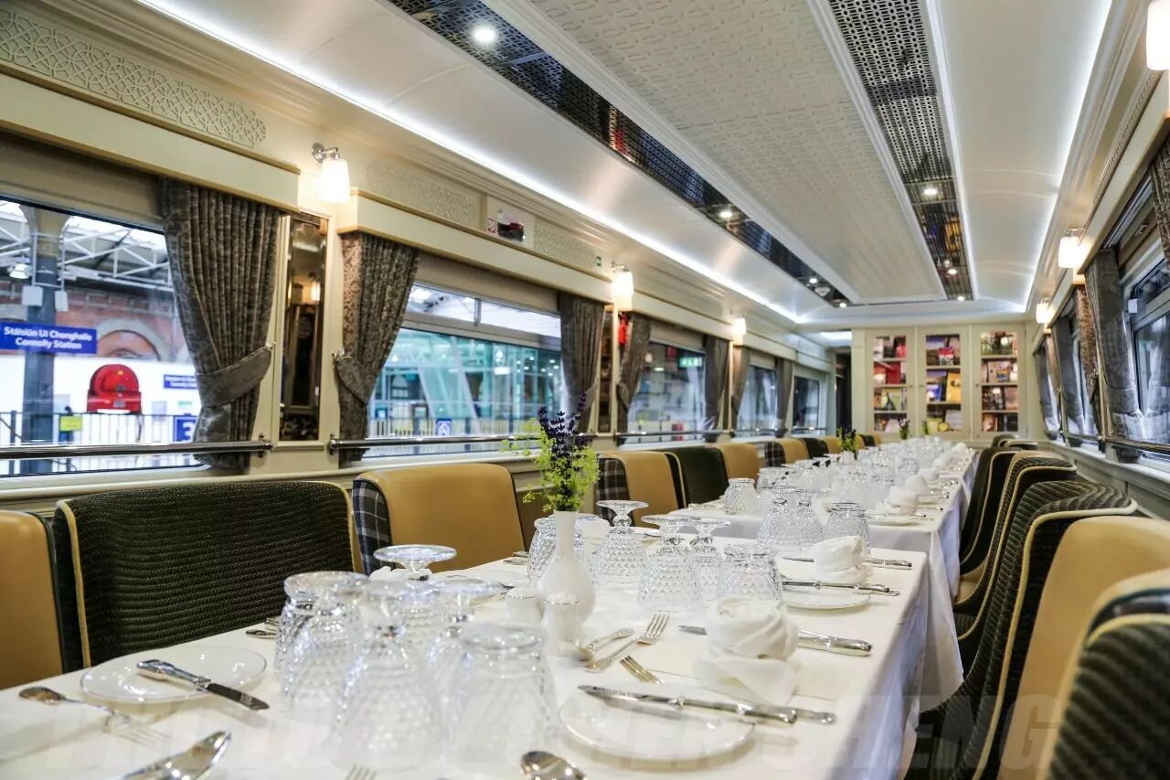 结束一天的私人游览,返回列车就如同回到移动的城堡中,晚餐已经准备好。Grand Hibernian的车厢除了末尾来自英国的工作车厢之外,都在爱尔兰制造,它们是上世纪80年代爱尔兰铁路系统中的客车。Belmond集团购买些了这些车厢,经过重新改造,分别用翡翠岛屿上的城市命名。