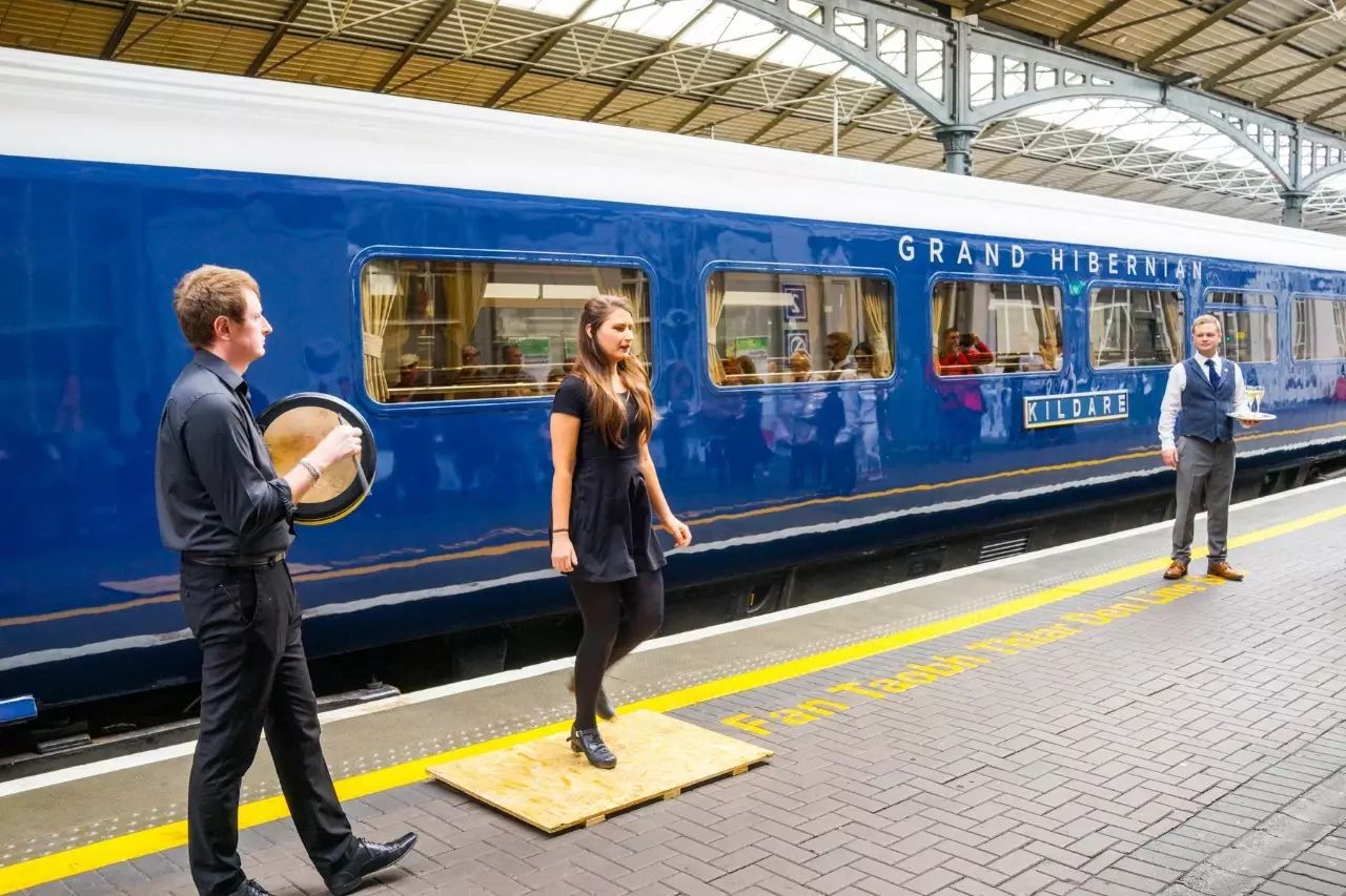 从酒店出发乘坐专用巴士穿过都柏林城区,你可以毫无阻碍地走入Heuston火车站的站台,深蓝色的专列已经准备就绪,年轻的爱尔兰舞者和她的伙伴正用快节奏的音乐吸引着你的目光,香槟是登车前的音量,红毯则是站台上醒目的提示。其他乘客们赞叹的目光让你知道,当你乘坐这趟列车欣赏美景的同时,你也成为了一道独特风景。