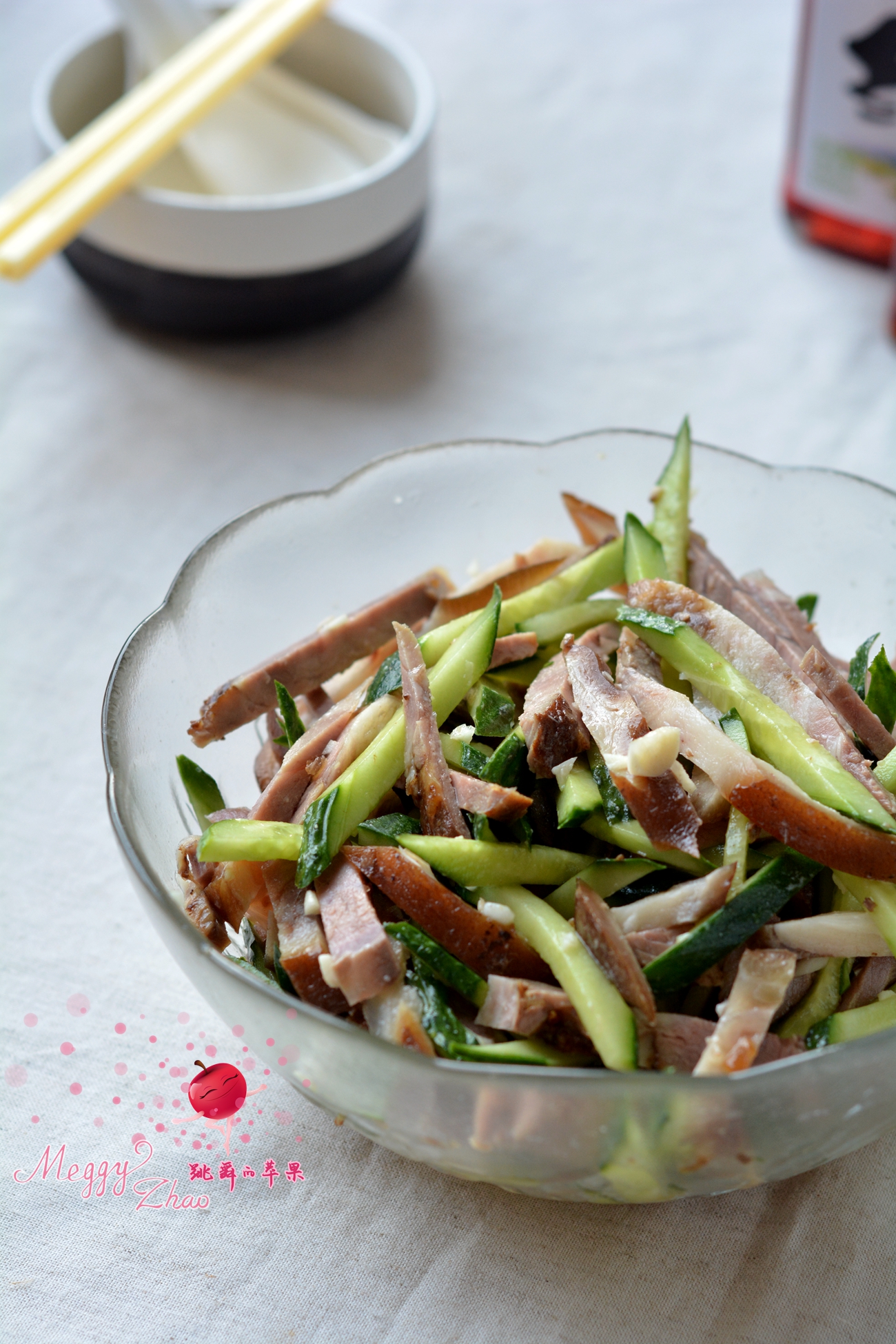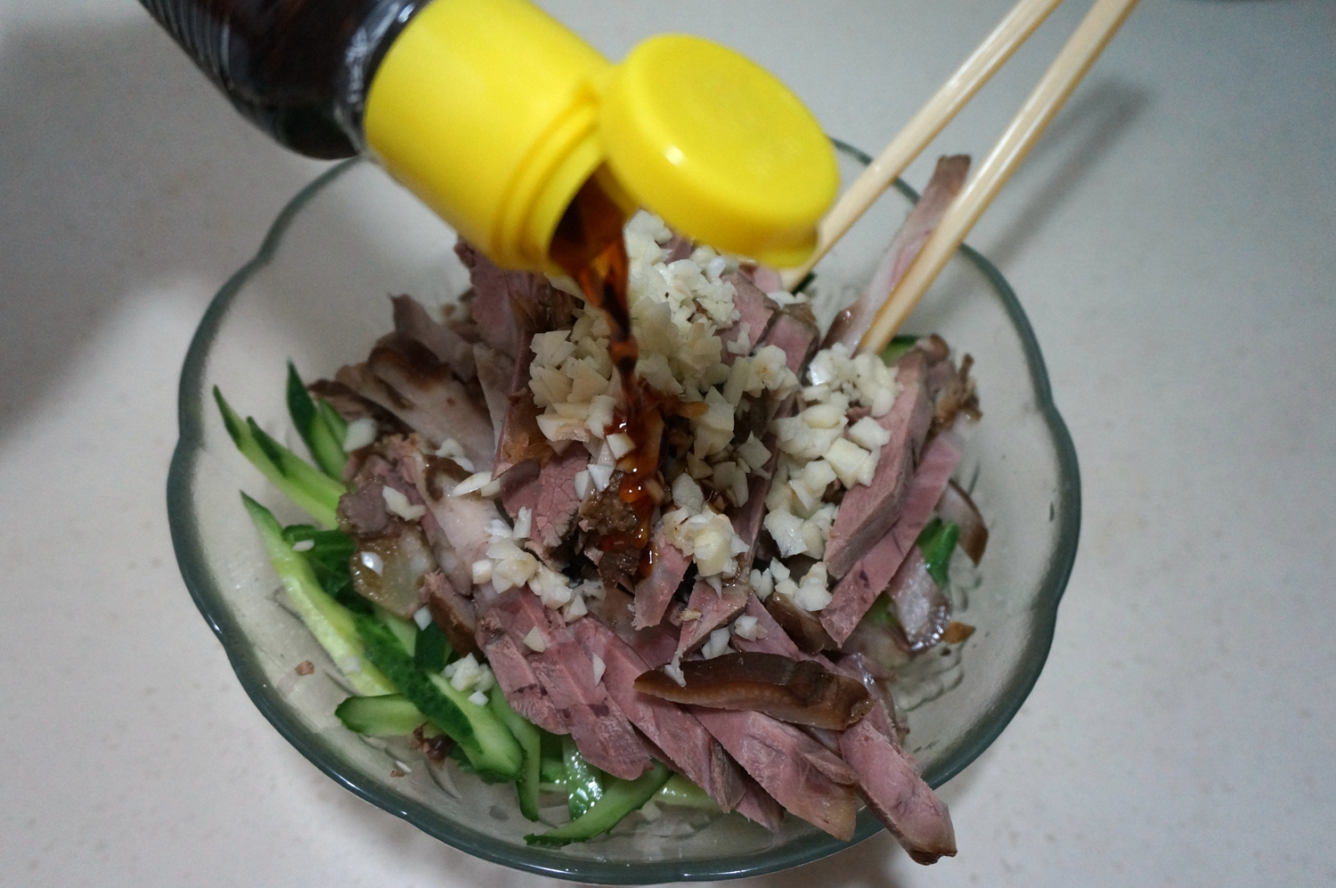 材料:自制酱肘子半个,黄瓜1条,大蒜3瓣,醋适量,盐少许,生抽少许,辣椒油适量
