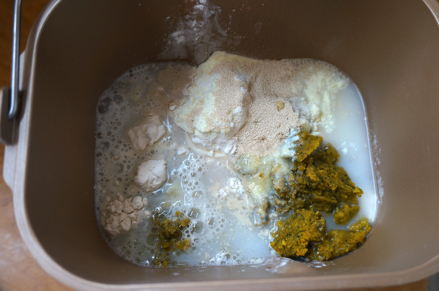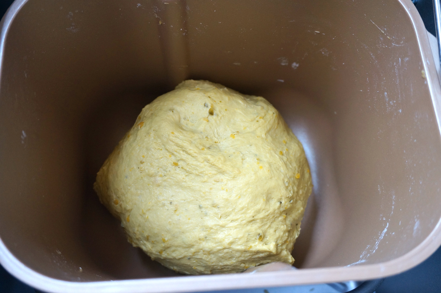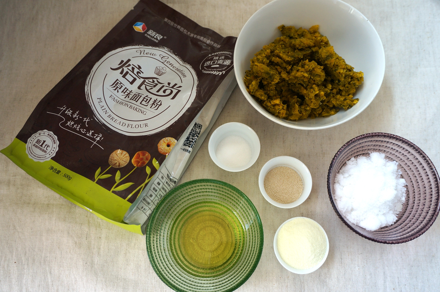 材料:高筋面粉(面包粉)350克,酵母4克,细砂糖40克,盐5克,奶粉15克,南瓜泥150克,水210克,玉米油35克