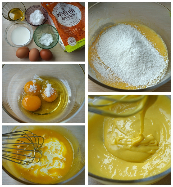 材料:50克带壳鸡蛋3个,低筋面粉(蛋糕粉)60克,蛋黄用绵白糖10克,蛋白用绵白糖45克,玉米油30克,牛奶40克