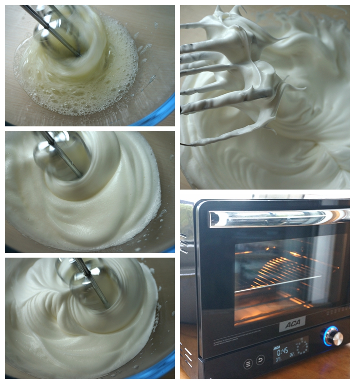 3. 蛋白分三次加入白糖,最后一边关开关一边提起打蛋头,蛋头上的蛋白糊呈小弯钩或者直角都可以;小弯钩状态的蛋糕口感会润一些,小直角的蛋糕口感会偏干一些;