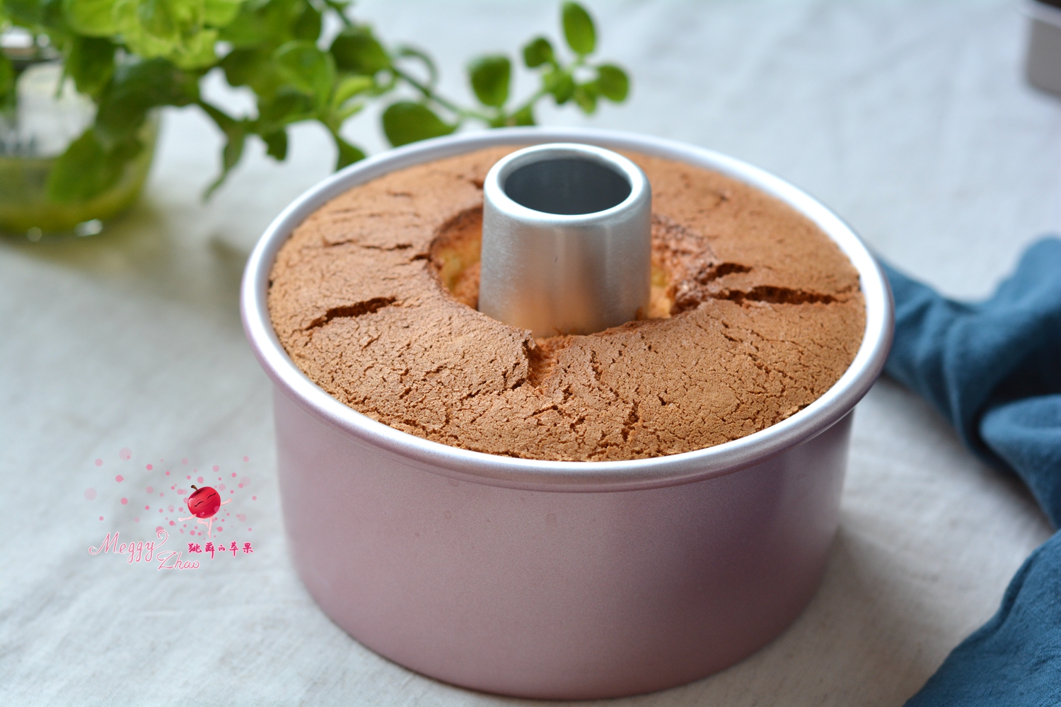 4. 出炉后的蛋糕一定要端起来轻震几下,将内部的多余热空气震出,才不会缩腰;彻底凉后再脱模;