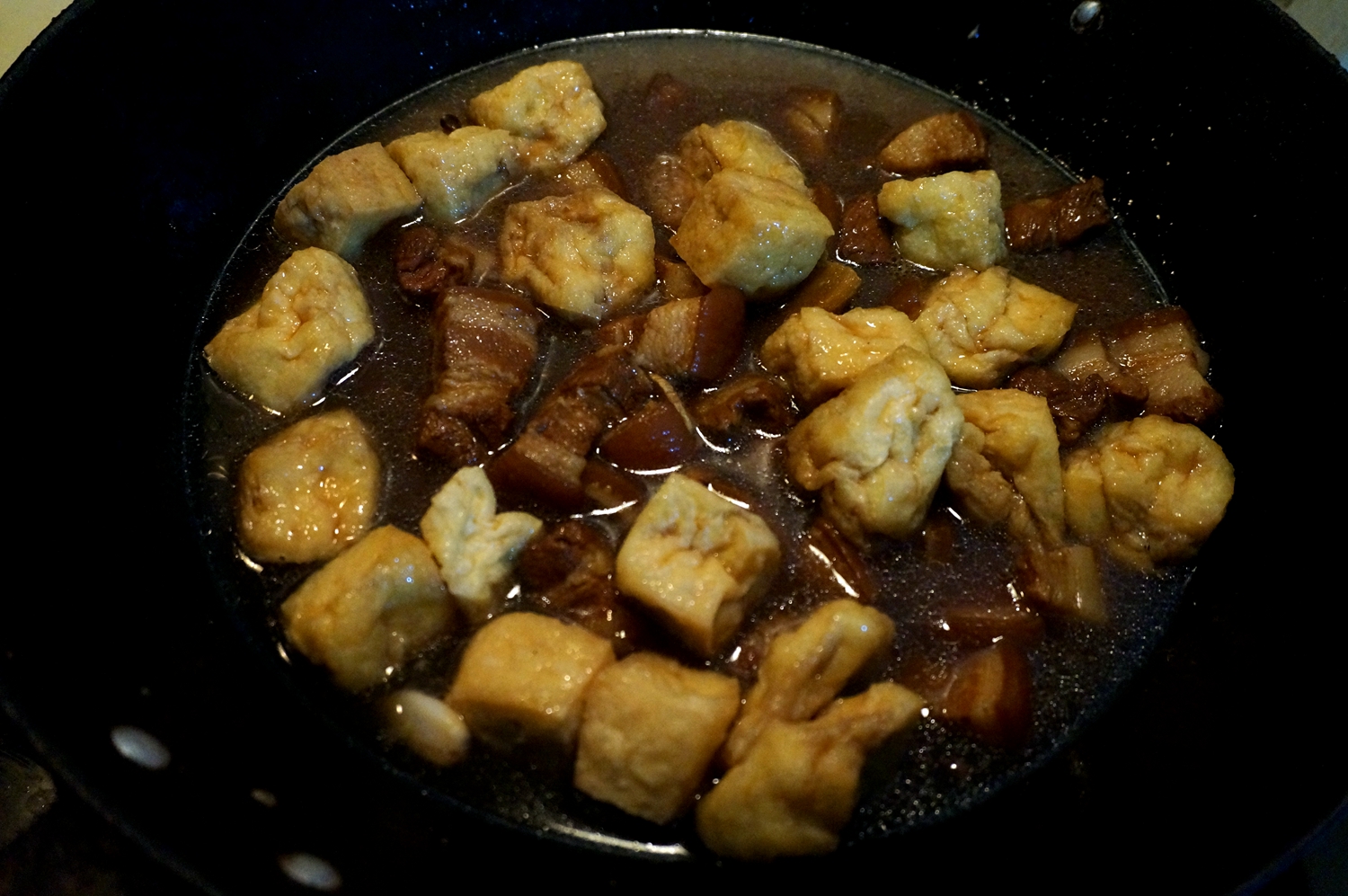 同样的一锅五花肉,根据不同的季节换不同的菜,即使天天吃,也不会觉得腻。特别是连汤带菜浇在米饭上,饭都要多吃一碗半碗。豆腐有时会换成油豆腐,我们这儿管它叫“豆泡儿”(一声),吸足了汤汁的豆泡儿肉香浓郁,一大个入口,这份满足啊~~