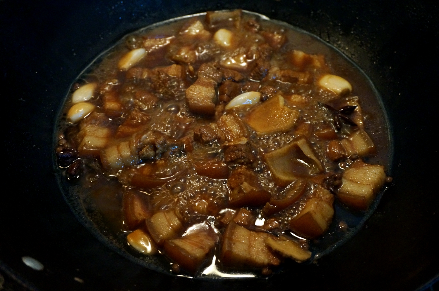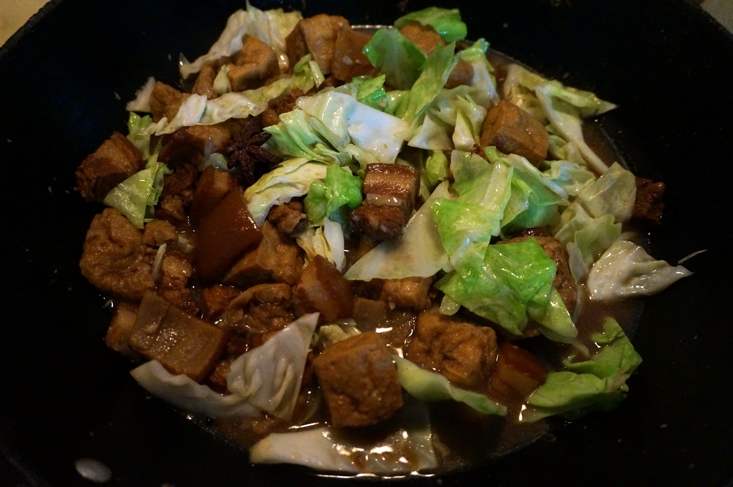 材料:五花肉500克,油豆腐(豆泡儿)一碗,圆白菜半颗,油少许,冰糖10粒左右,盐适量,料酒少许,酱油少许,八角两颗,花椒一撮,大蒜一把,姜一块