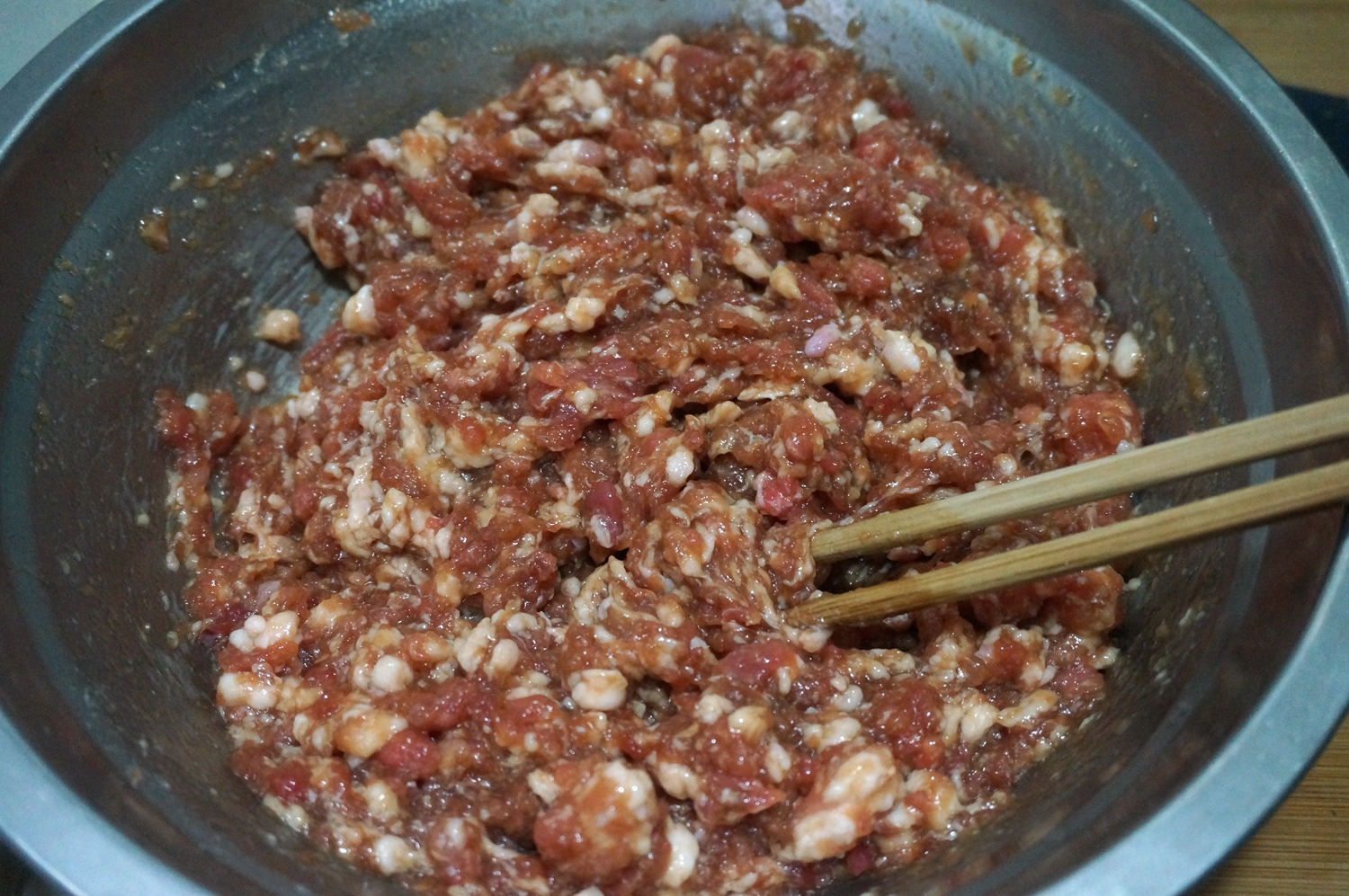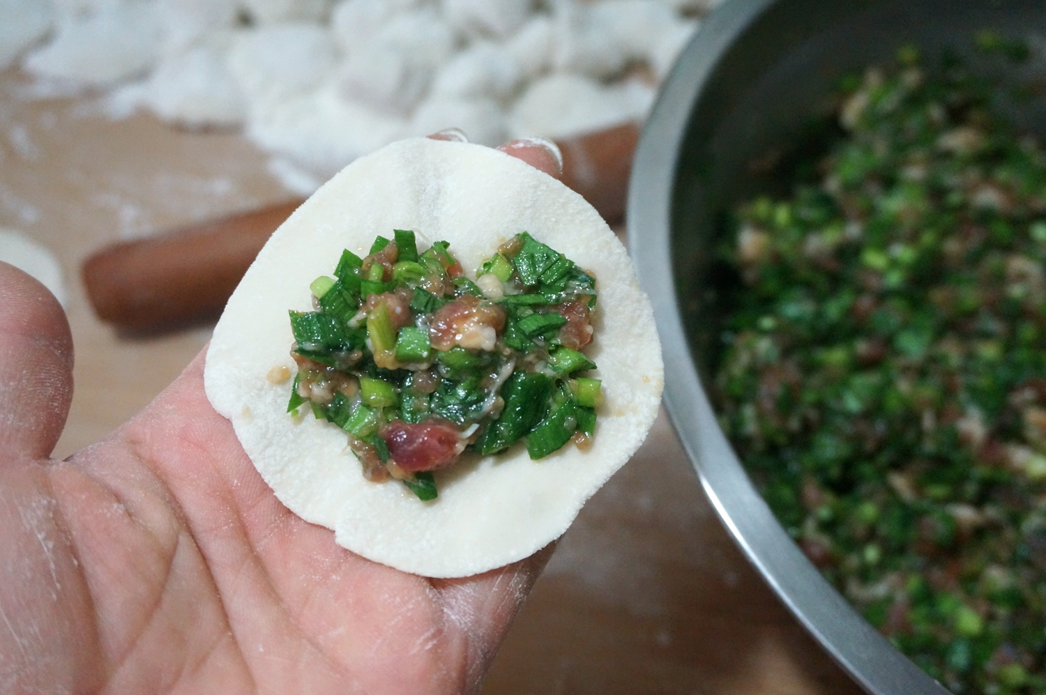 材料:猪肉适量,韭菜适量,面粉300克,开水100克左右,凉水100克左右,油适量,盐适量,生抽适量,蚝油适量