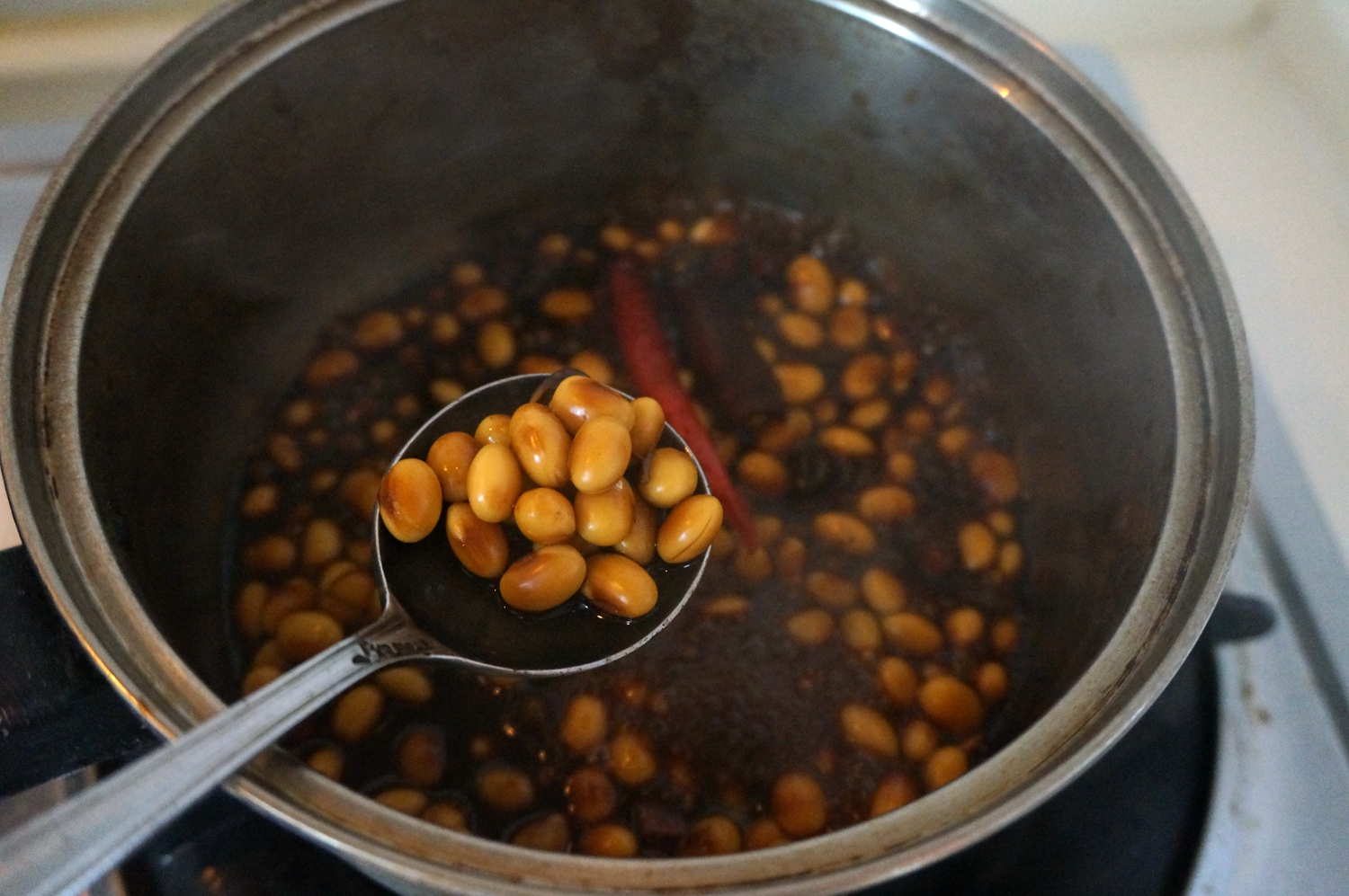 材料:泡发的黄豆一碗,八角三颗,花椒一撮,桂皮一块,酱油少许,盐少许,香葱少许
