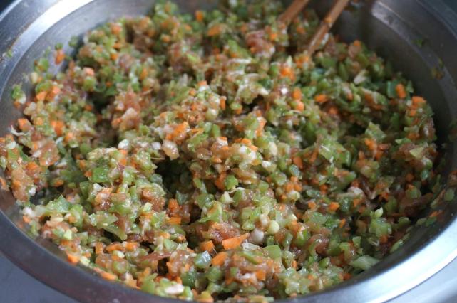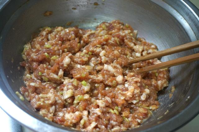 7. 全部材料入肉馅盆中,先不要搅拌,包之前再拌,防止出汤;