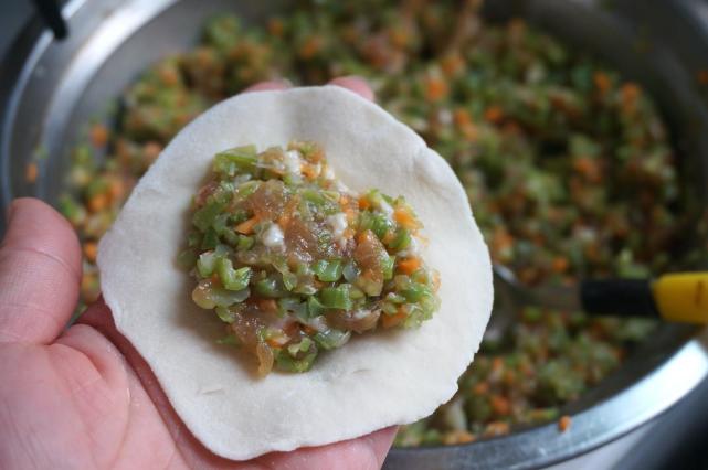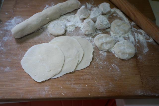 饧好的面团取出,放在案板上,搓成长条,再切成大小均匀的剂子,跟平时包饺子的差不多大,擀成一样薄厚的皮,因为是烫面的,所以不用边缘薄中间厚;