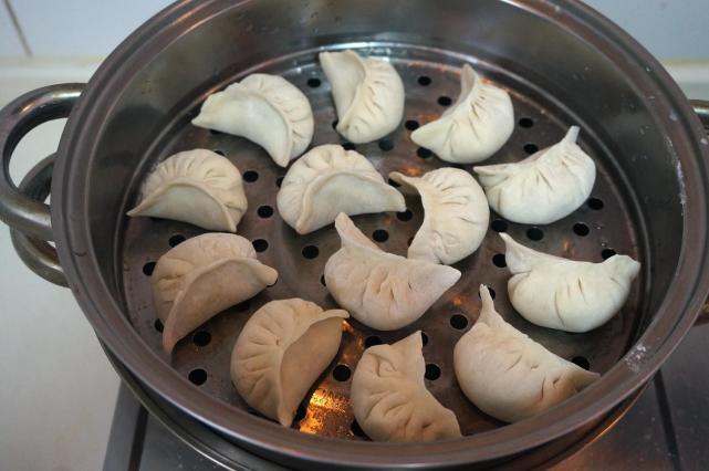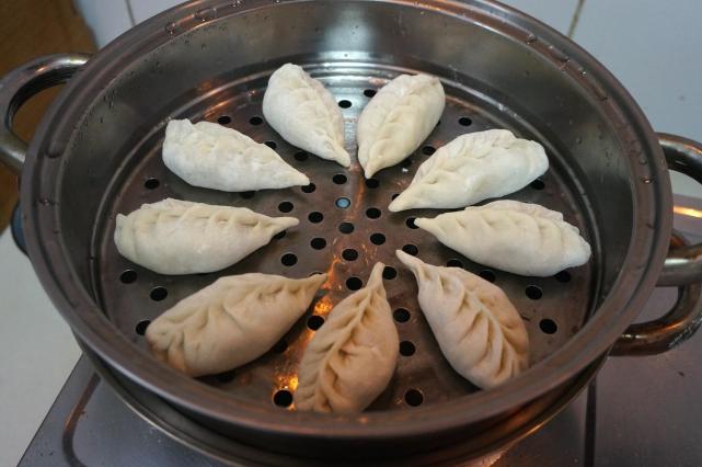 11. 将包好的饺子码放在抹了一层油的蒸屉上,盖盖子,大火上汽后蒸8-10分钟;