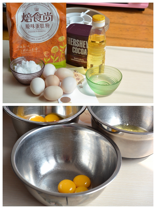 材料:柴鸡蛋12个,白糖160克,低筋粉190克,可可粉30克,玉米油120克,凉水160克,淡奶油300克,奶油用白糖30克