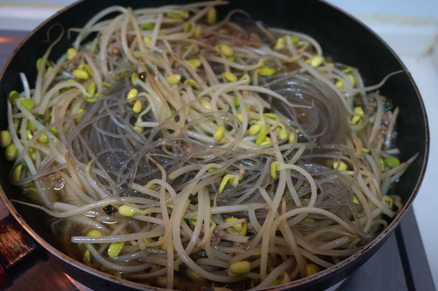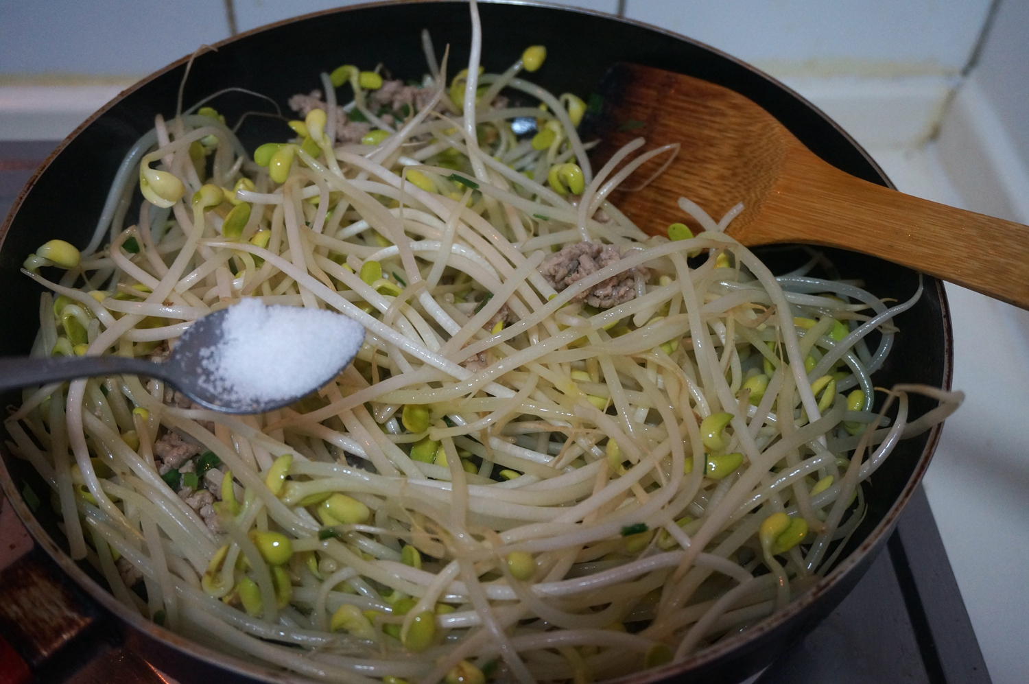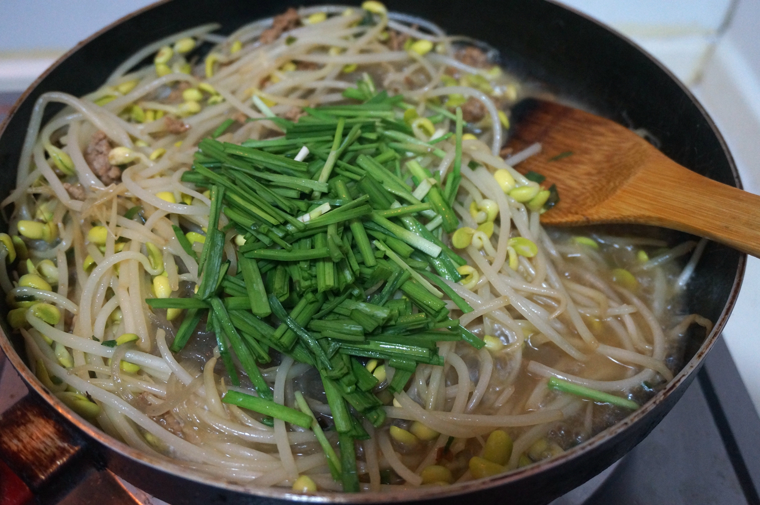 材料:黄豆芽一盘,猪肉馅适量,红薯粉条一把,韭菜一撮,小葱数根,油适量,盐适量,酱油少许,生抽少许,辣椒适量