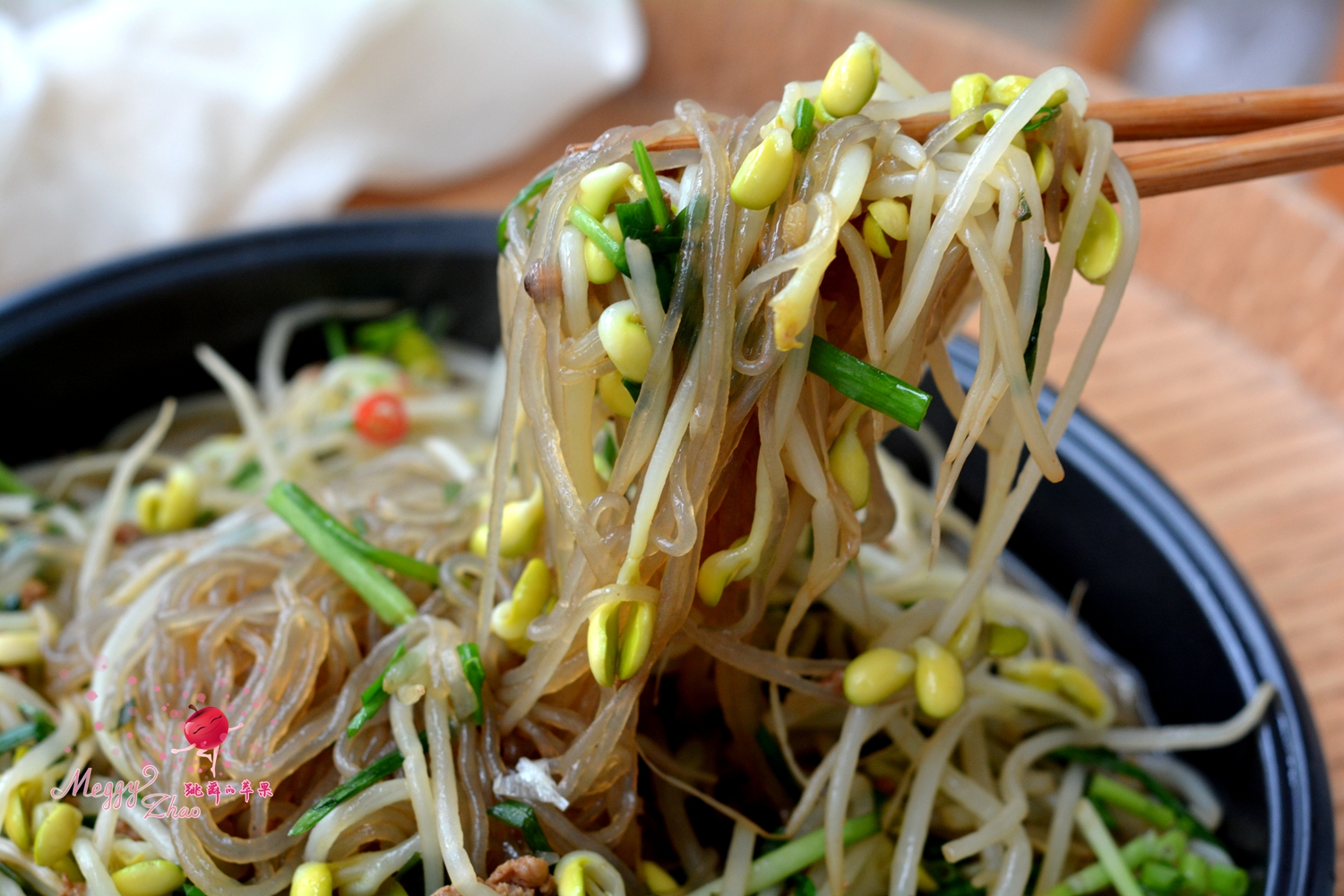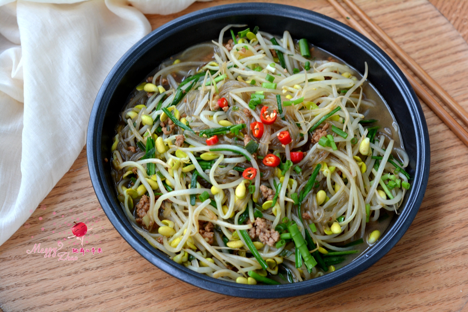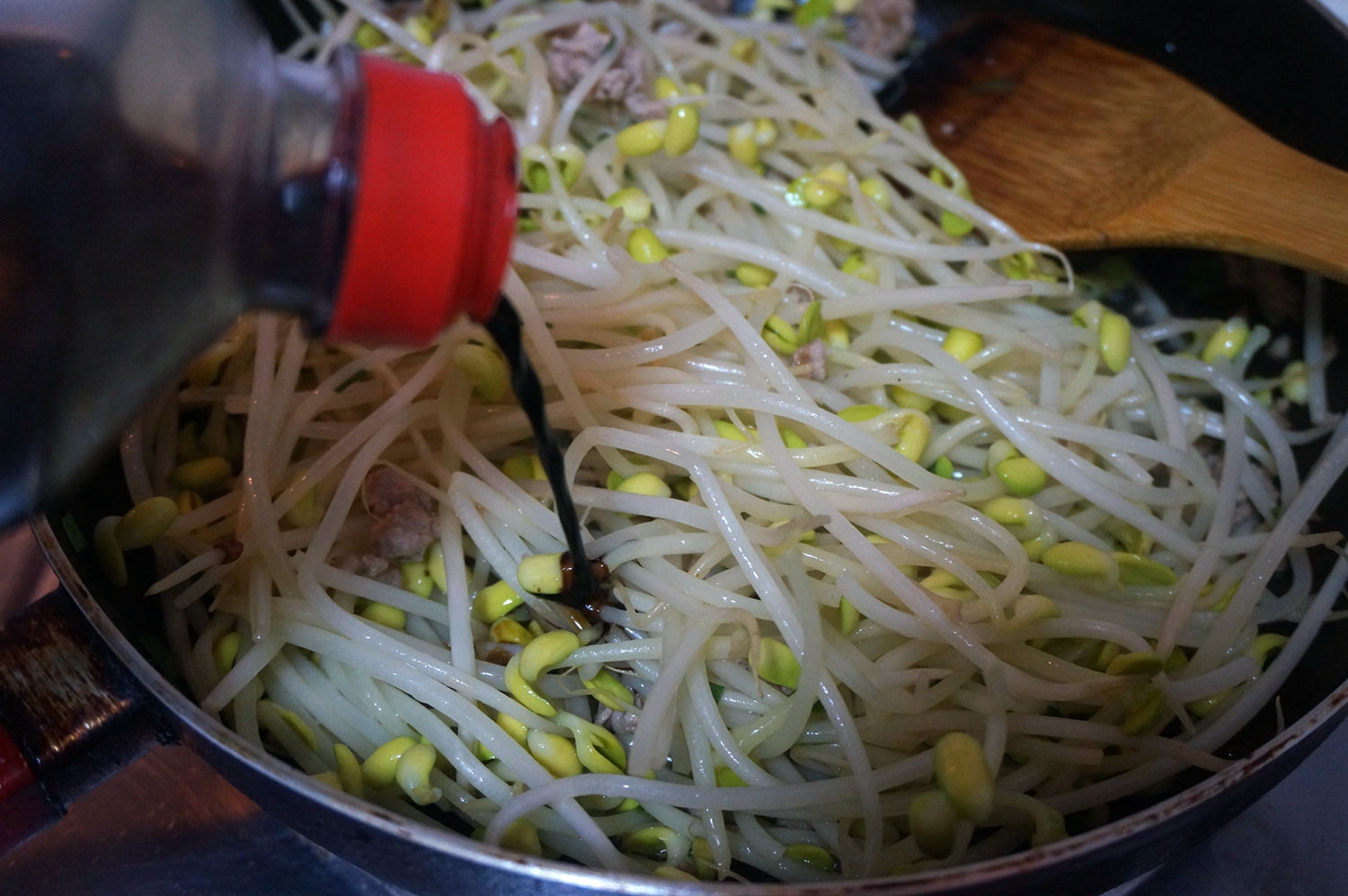 材料:黄豆芽一盘,猪肉馅适量,红薯粉条一把,韭菜一撮,小葱数根,油适量,盐适量,酱油少许,生抽少许,辣椒适量