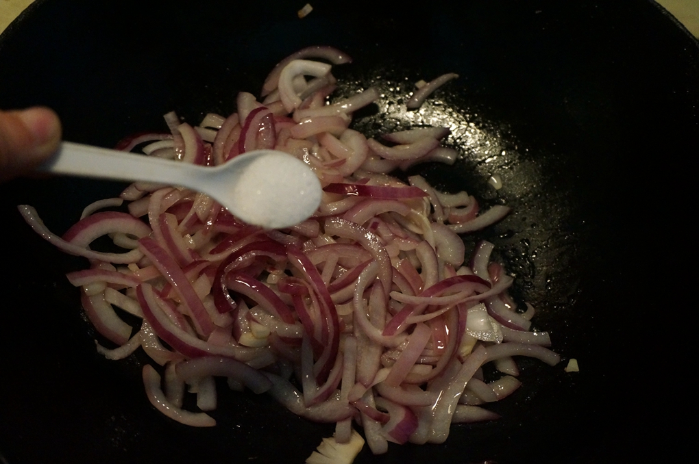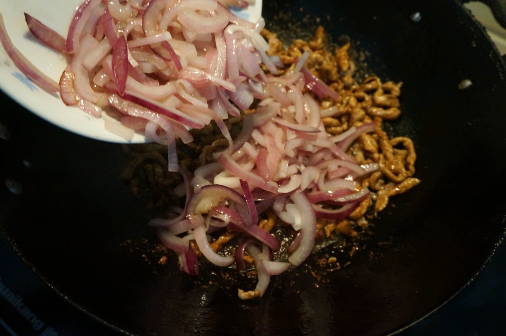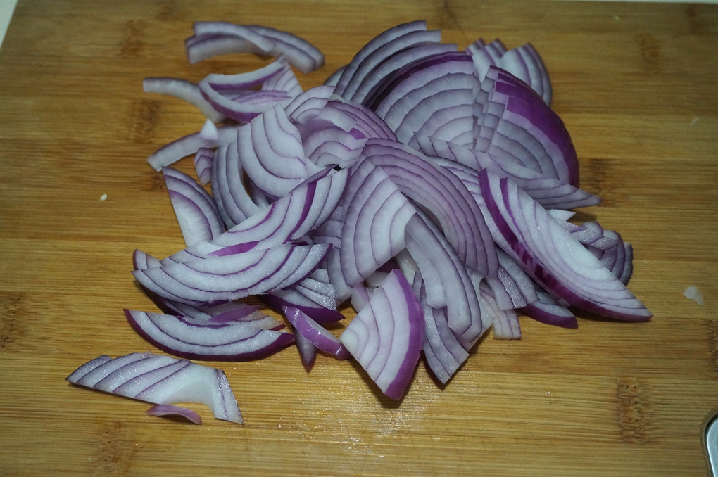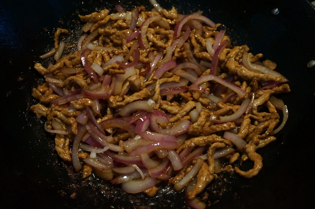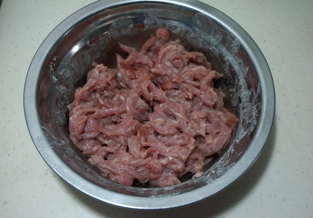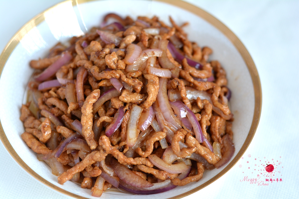 材料:猪肉丝200克,紫皮洋葱1个,淀粉一小勺,料酒少许,盐适量,酱油适量,植物油适量