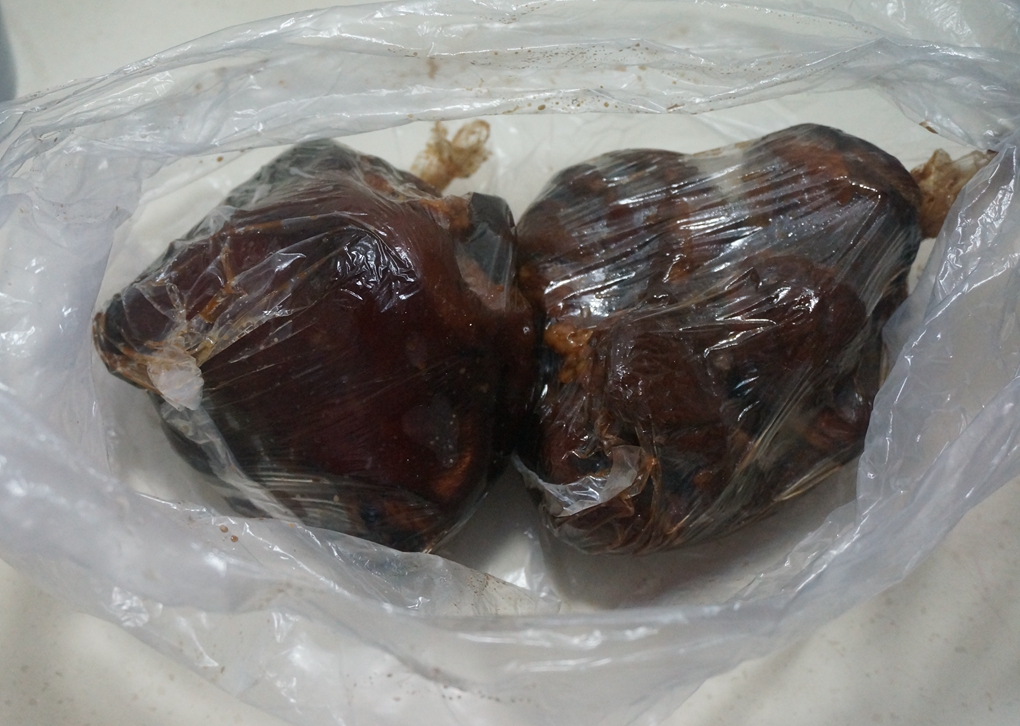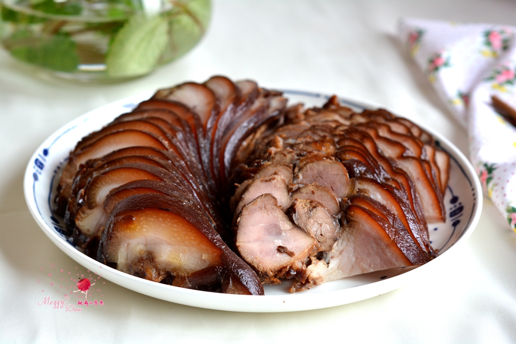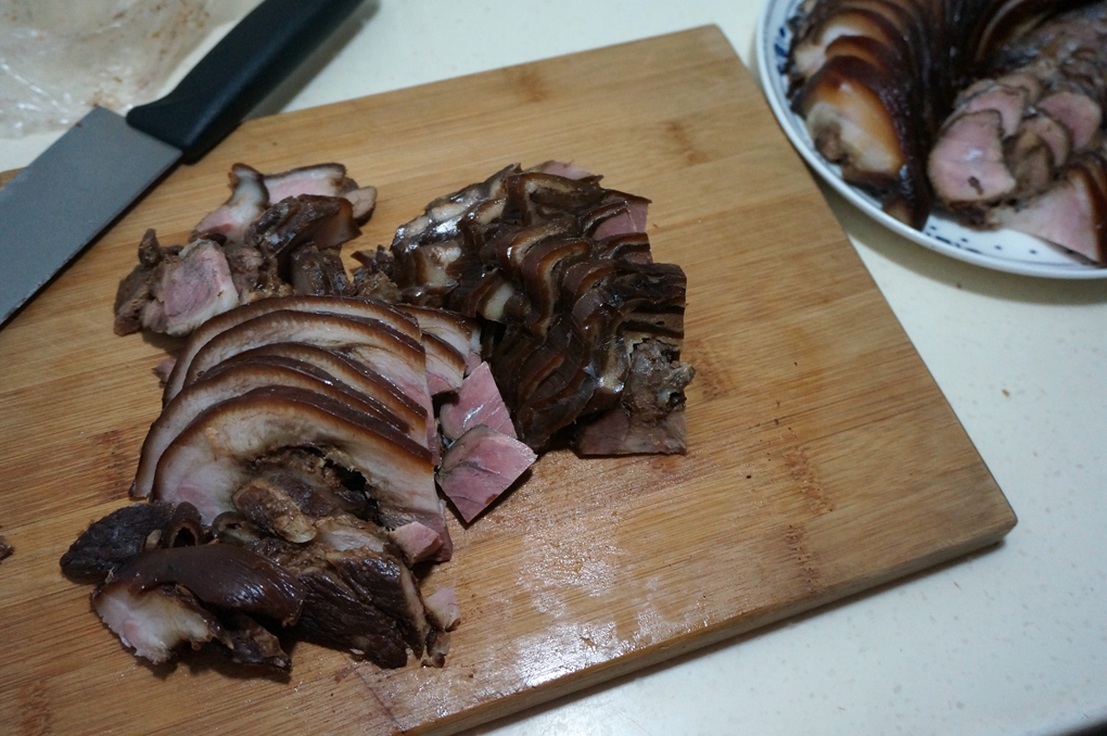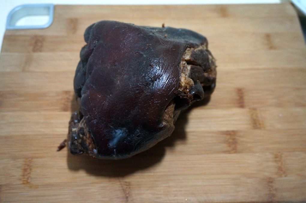 大肘子如果一次炖一个,一是费火,二是不够吃,所以我建议最好能一次酱两个。带骨酱或者剔骨酱都成,看您的喜欢。待肘子酱到能用筷子轻松扎透时,关火,把肘子在汤里焖着很是吸味儿。等到温热时,把肘子重新团成球装保鲜袋里,放冰箱里冷藏变硬,然后切片食用。