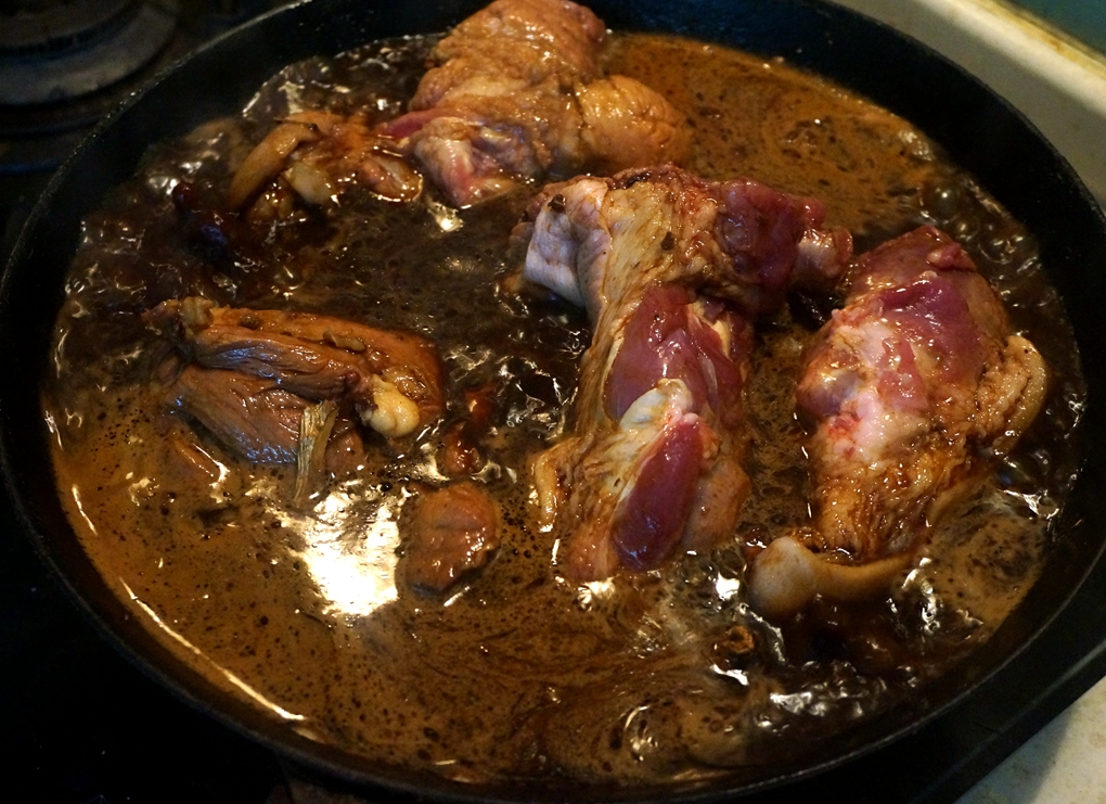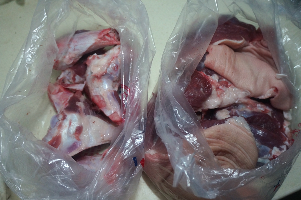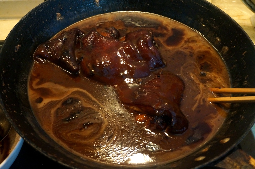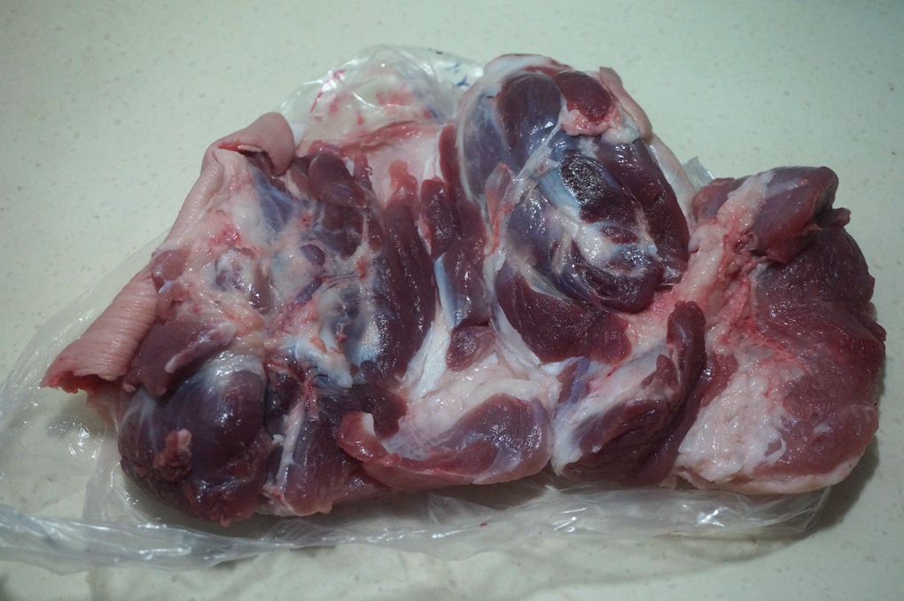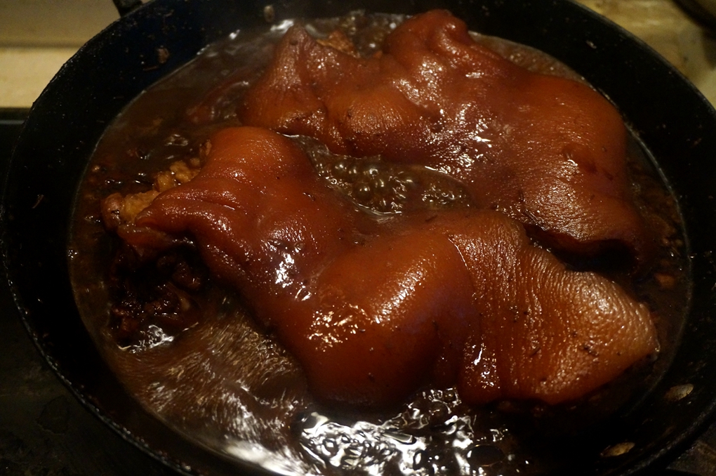 材料: 猪肘子两个,老汤一碗,八角5颗,花椒一把,香叶数片,干姜一块,盐适量,酱油适量