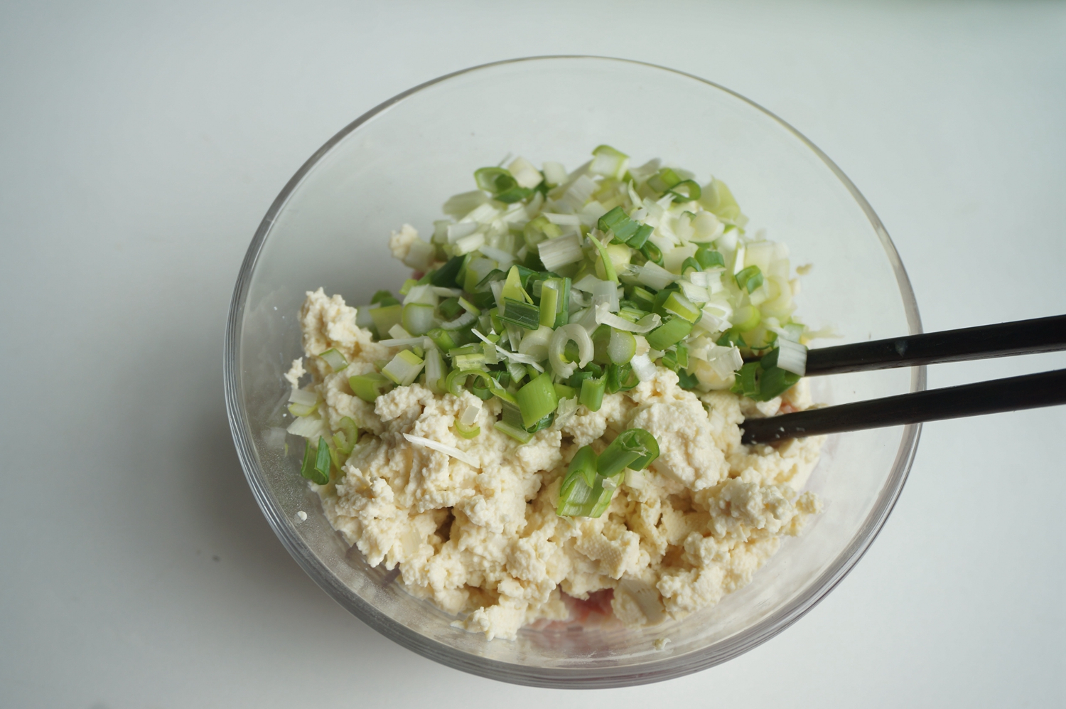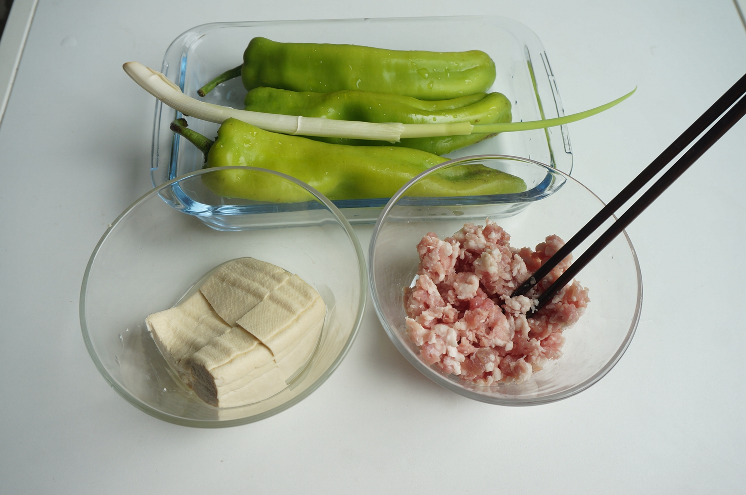 材料:尖椒3个,肉馅150克,豆腐一块,大葱一棵,盐少许,生抽少许