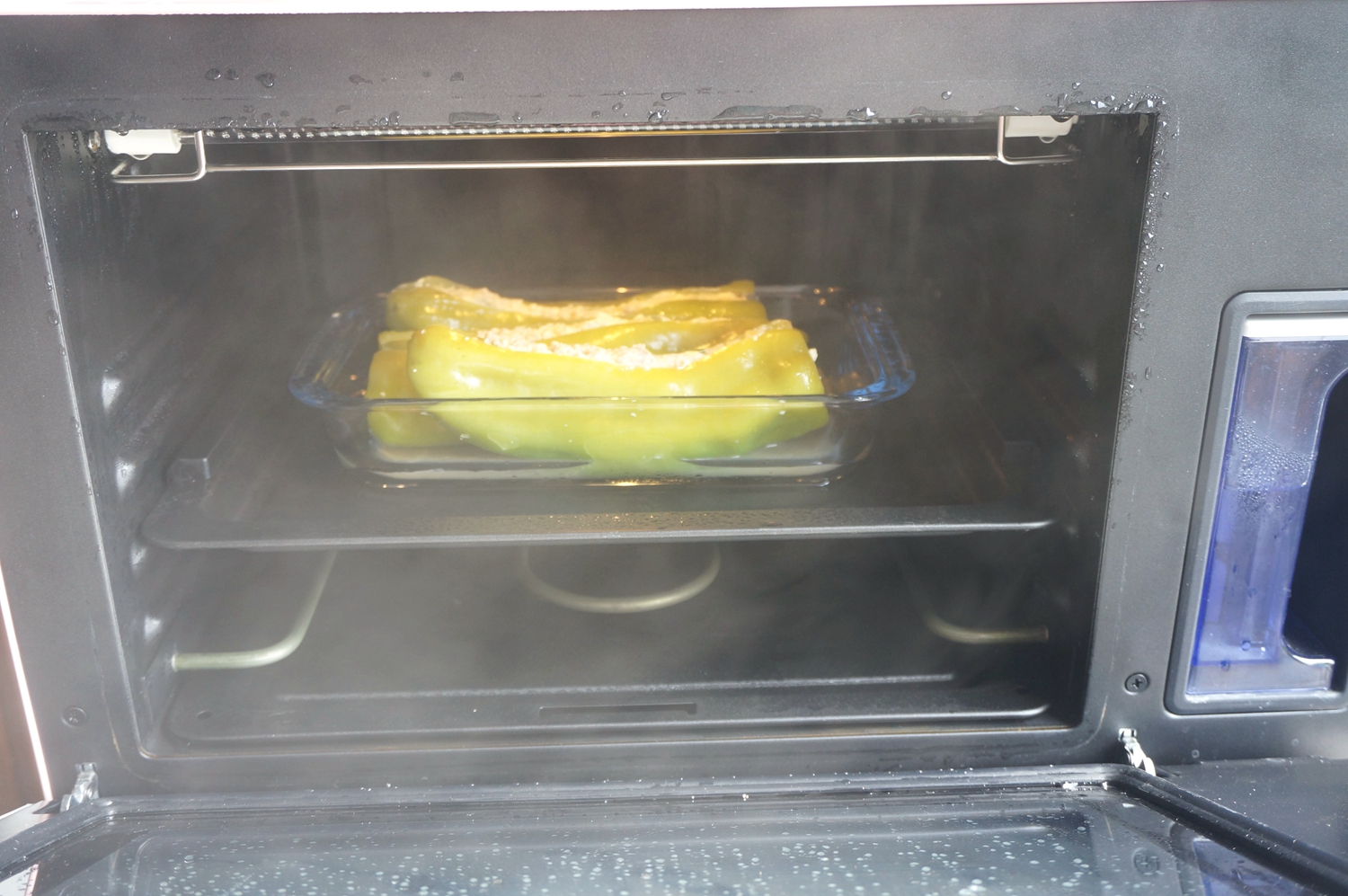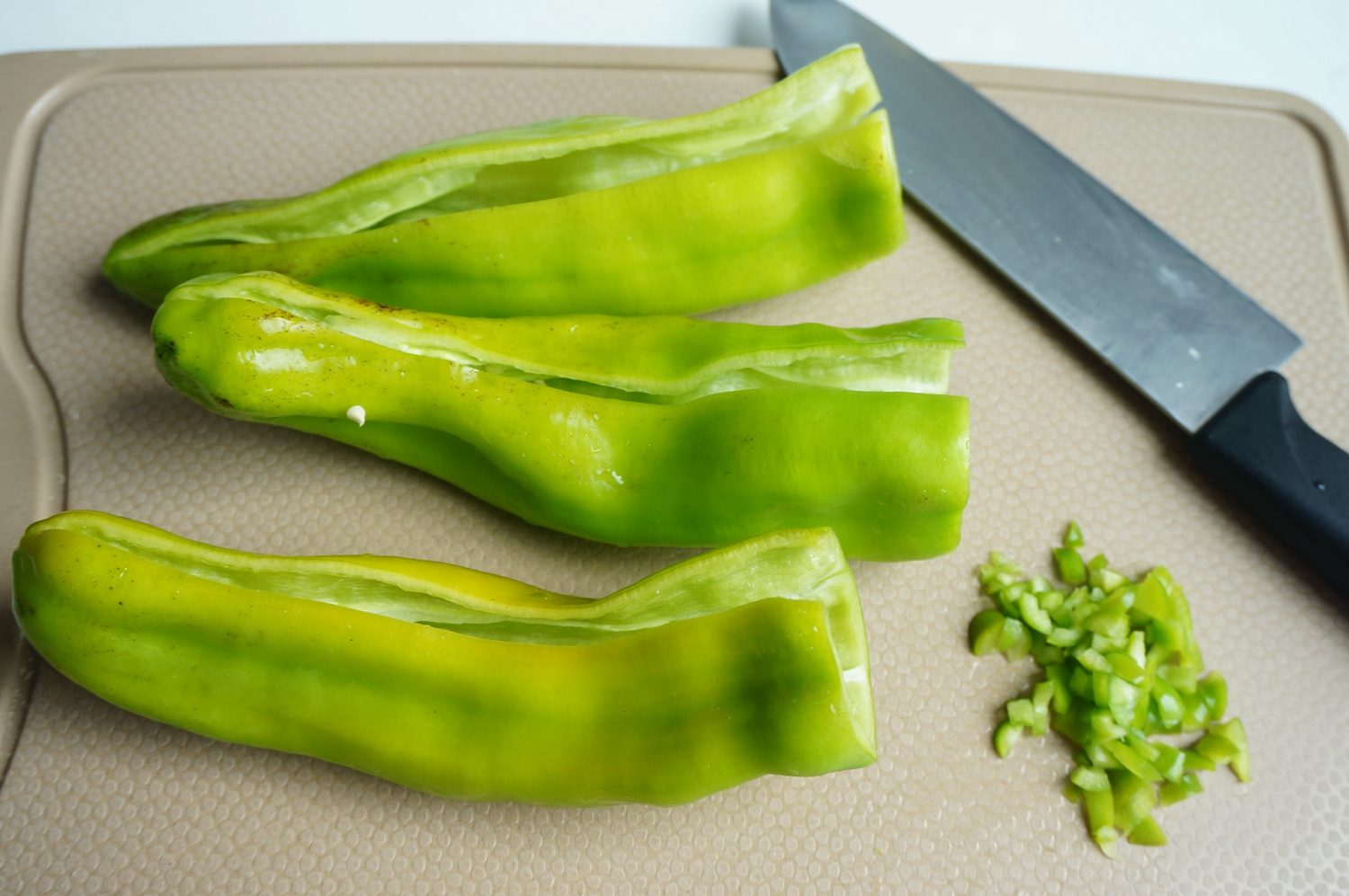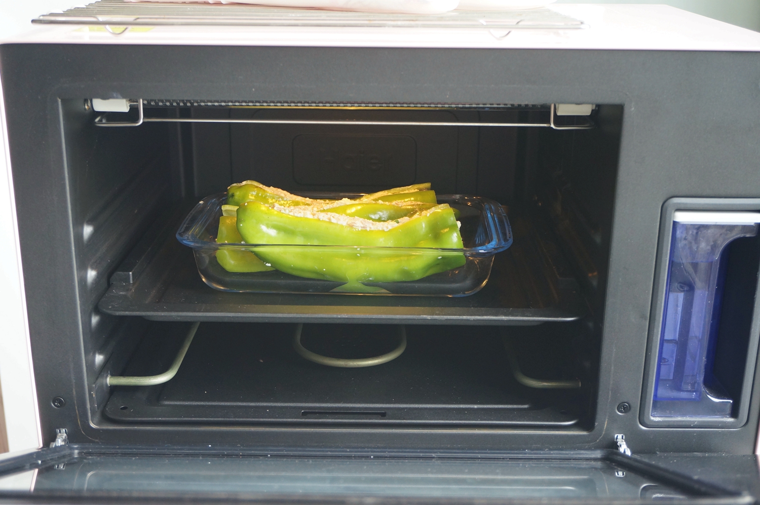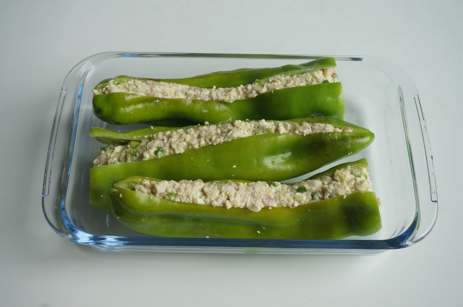 肉里面放了一块豆腐,这样吃起来不油腻,还增加植物蛋白质,口感也嫩。虽然成品的颜色不及煎的虎皮那么漂亮,但咱这好处多多啊!前面已经提到了,这里不再赘述了呵。一滴油不放,也能吃到香又嫩的尖椒酿肉,借着肉味豆腐也好吃,还能给身体补充钙,一家老少都吃得好开心。