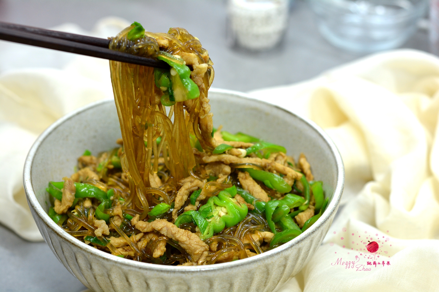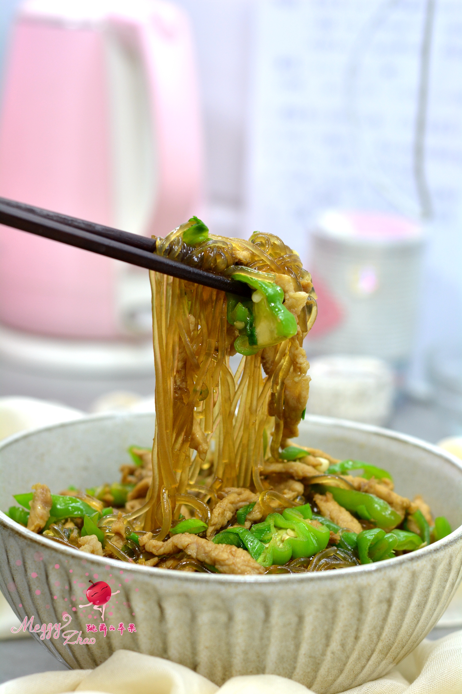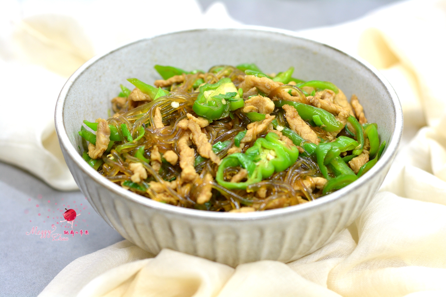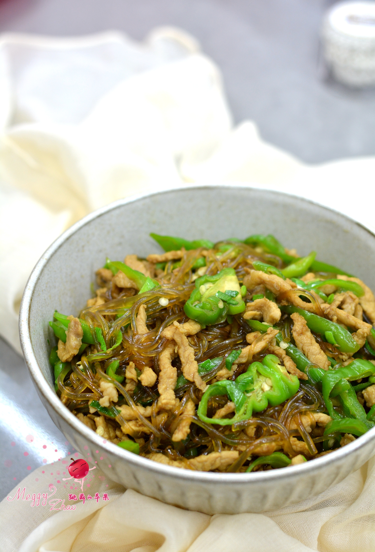 辣椒是那种又长还有弯弯的,口感嫩但是又辣到好处,吃起来不燥;粉条是红薯的,泡完之后再用水煮一煮变软,直接入肉丝锅里,吸一吸肉汤挺香的。辣椒生着吃都成,所以随后放进去,略微翻拌几下,又绿又有味道。出锅前我又撒了点青蒜末,香极了。如果用大蒜末,也是不错噢!