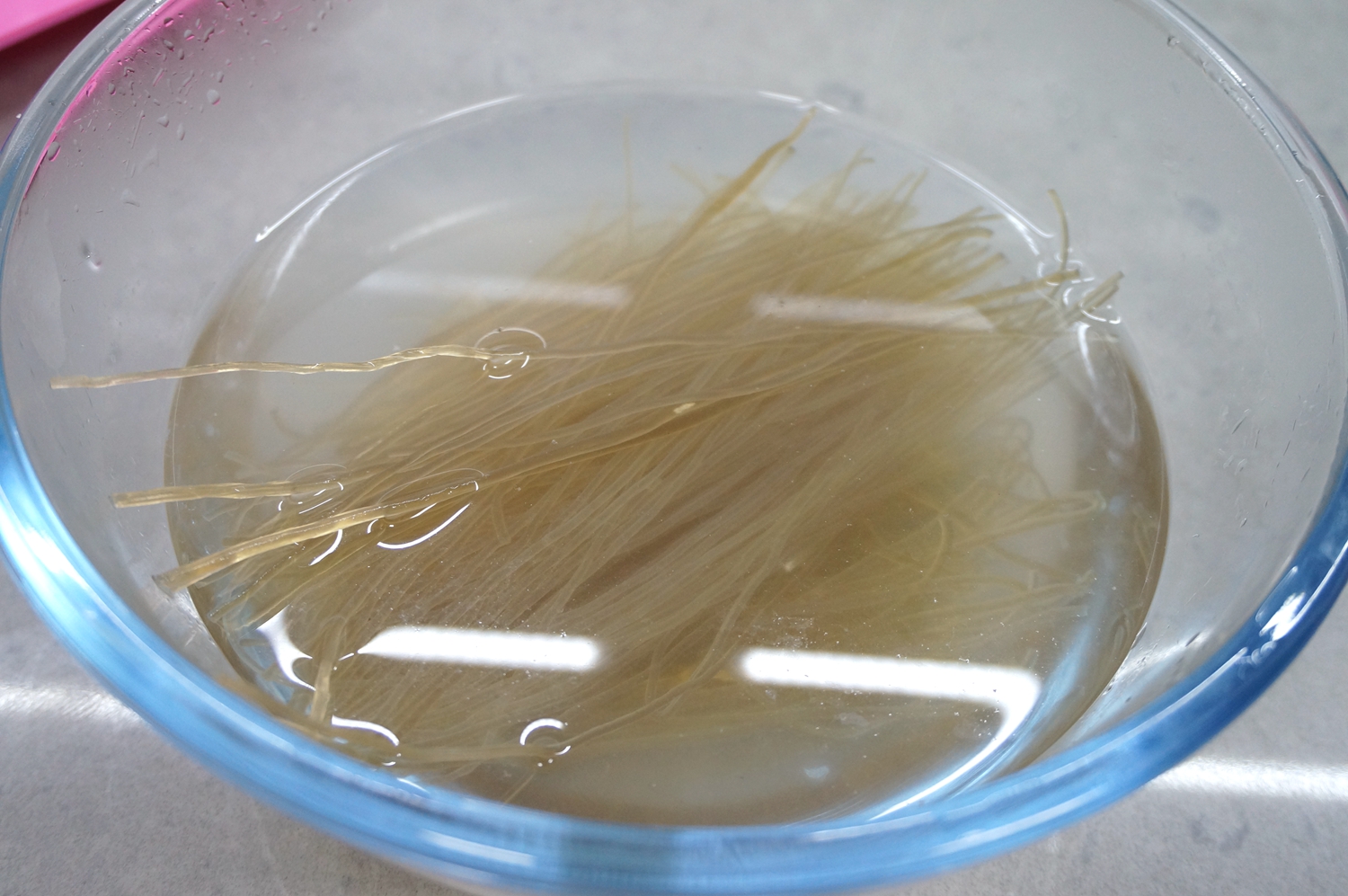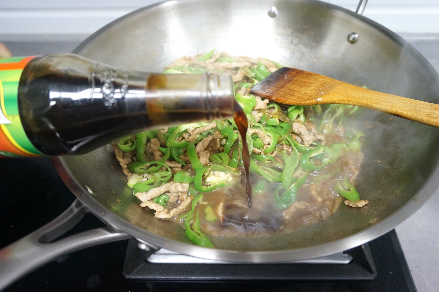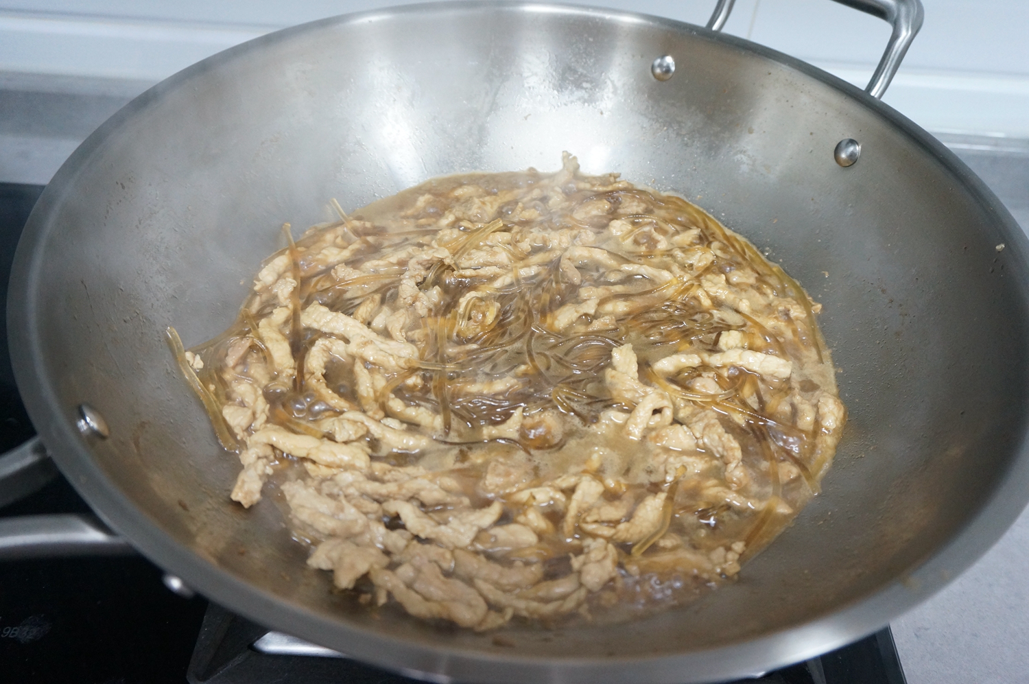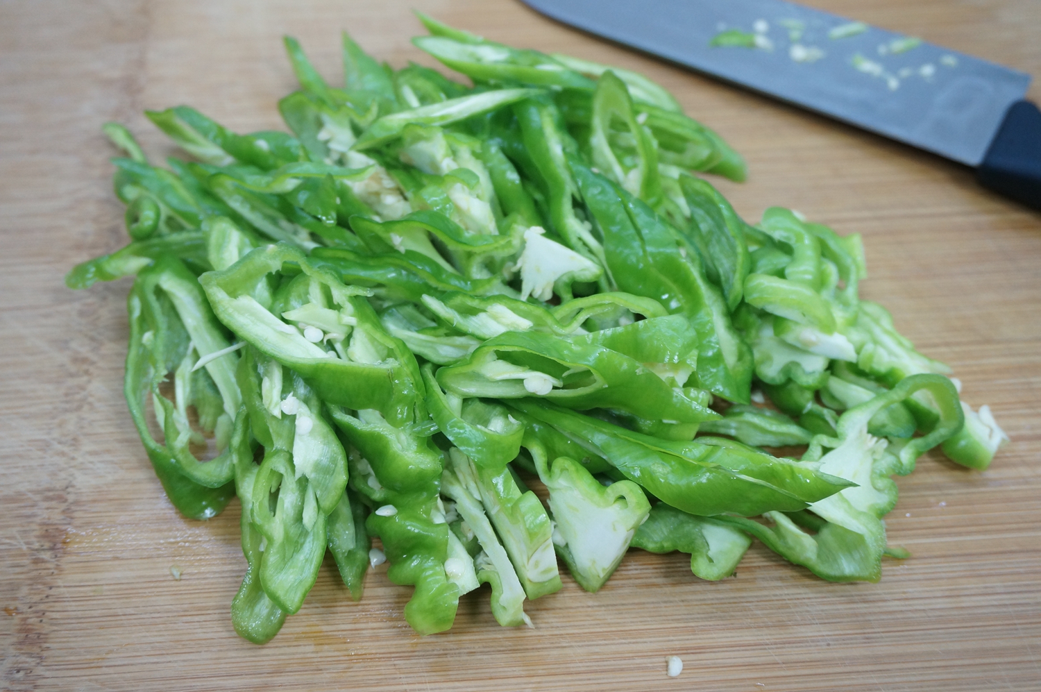 辣椒是那种又长还有弯弯的,口感嫩但是又辣到好处,吃起来不燥;粉条是红薯的,泡完之后再用水煮一煮变软,直接入肉丝锅里,吸一吸肉汤挺香的。辣椒生着吃都成,所以随后放进去,略微翻拌几下,又绿又有味道。出锅前我又撒了点青蒜末,香极了。如果用大蒜末,也是不错噢!