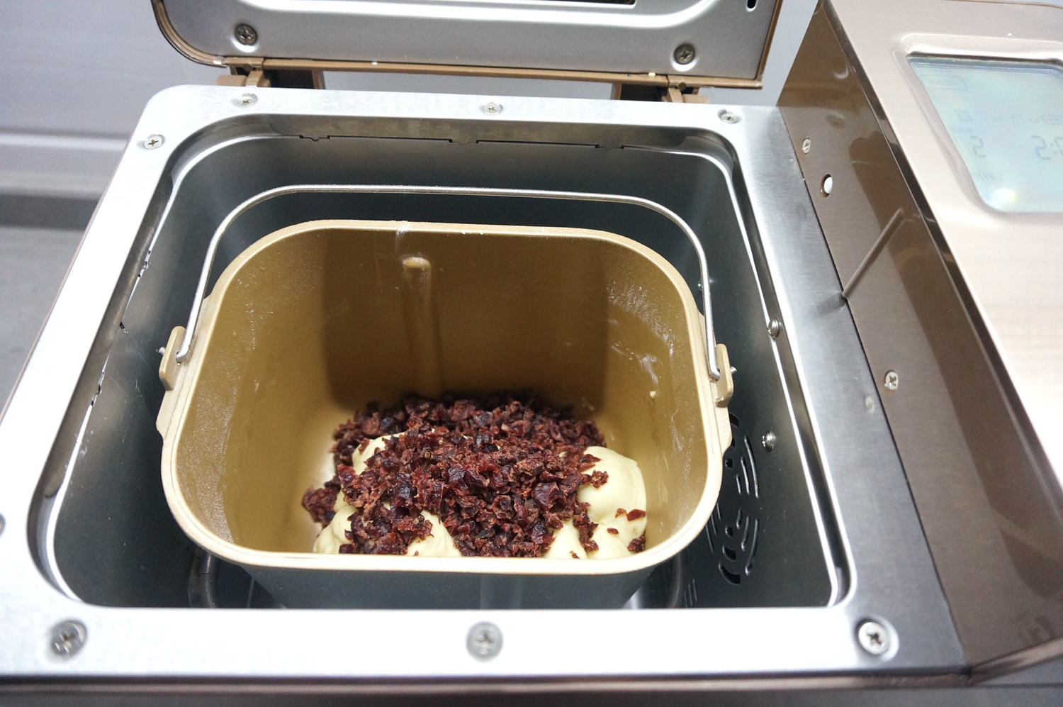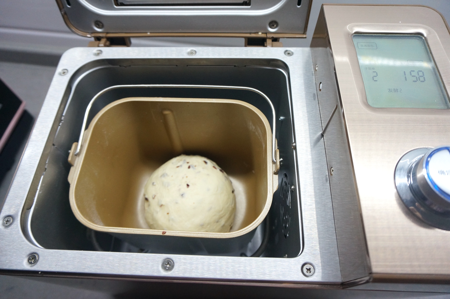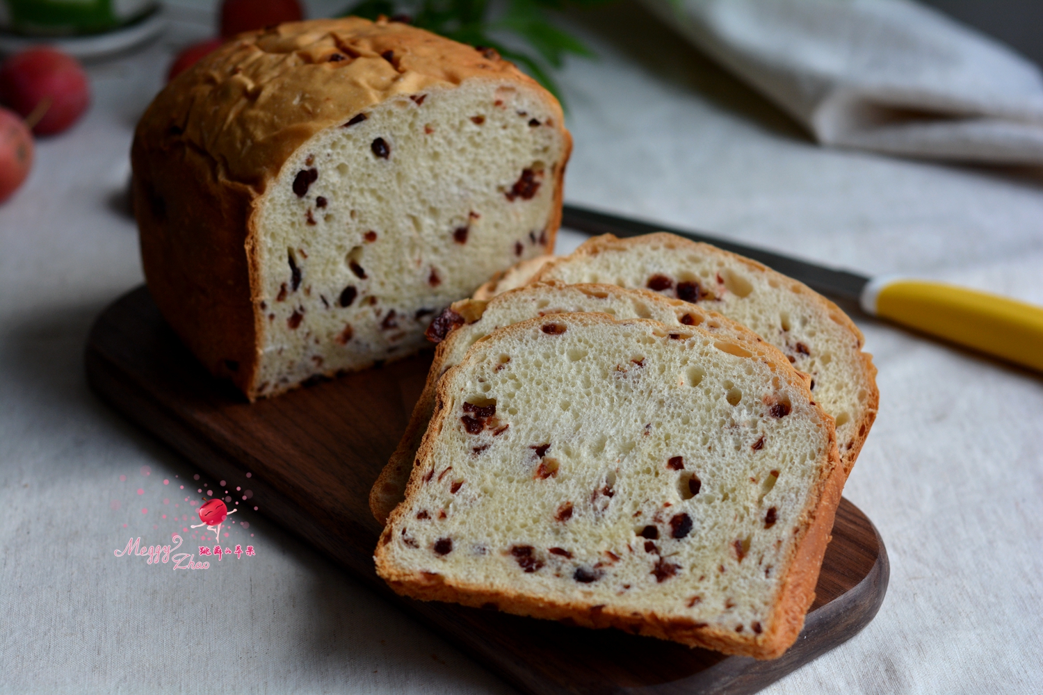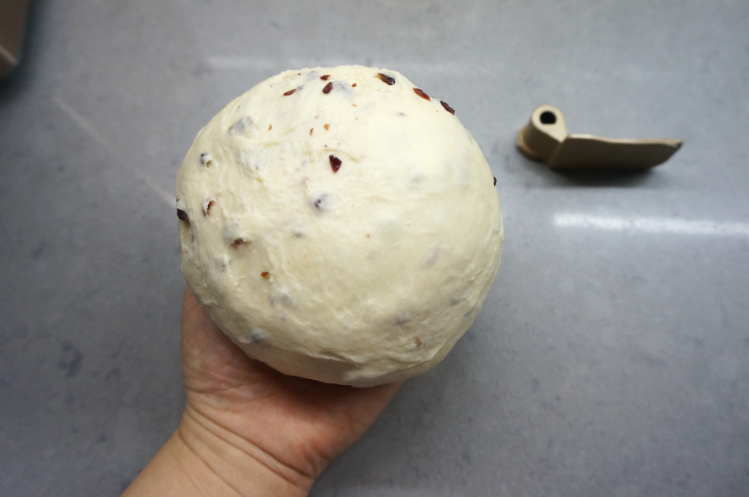 我时常用面包机做面包,省时省事,如果做为第二天的早餐,完全可以在睡觉前用面包机做个预约,一早起来就能吃上松软的大面包了。我今天的这个面包加了一些蔓越莓干,所以人工进行了一下干预;面包机的搅拌棒会让面包下面有个大洞,我也不喜欢,因此我也会把那个搅拌棒取出来。有果干果料在面包里,表面最好不要将这些露出来,会被烤糊,所以我通常都要把面团取出略微整理一下。