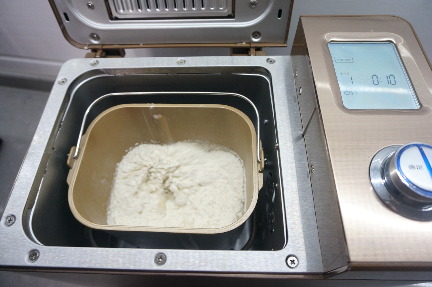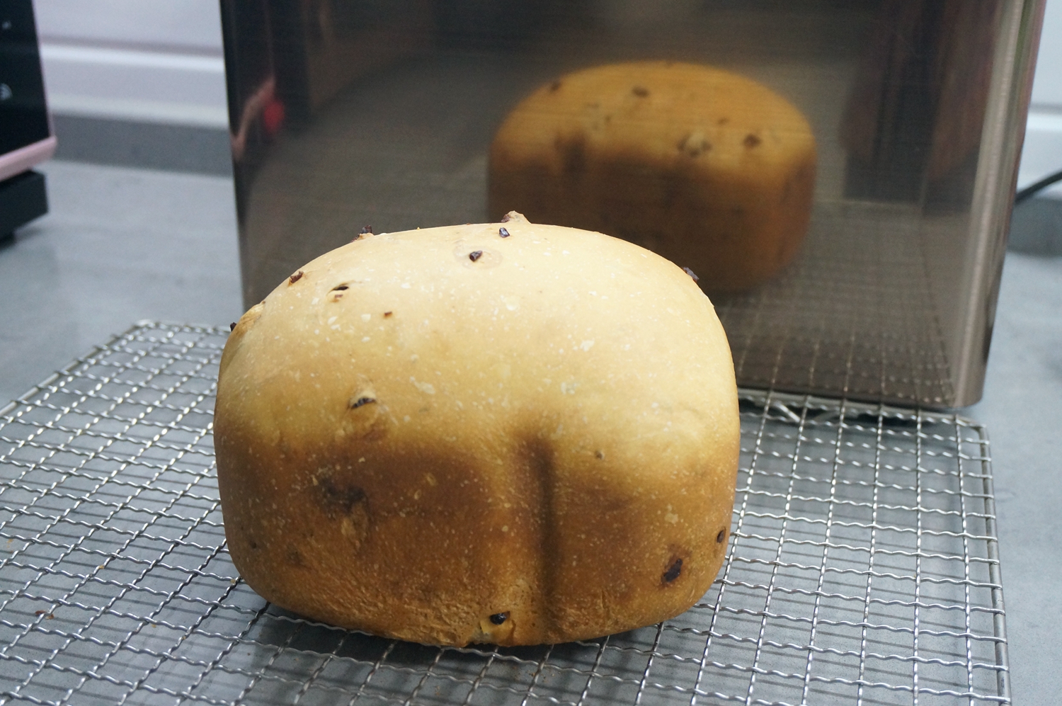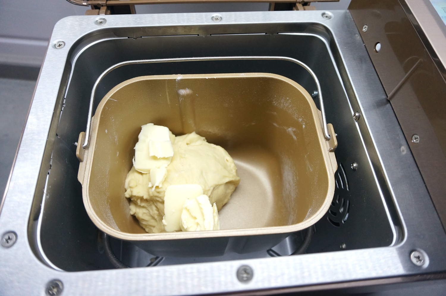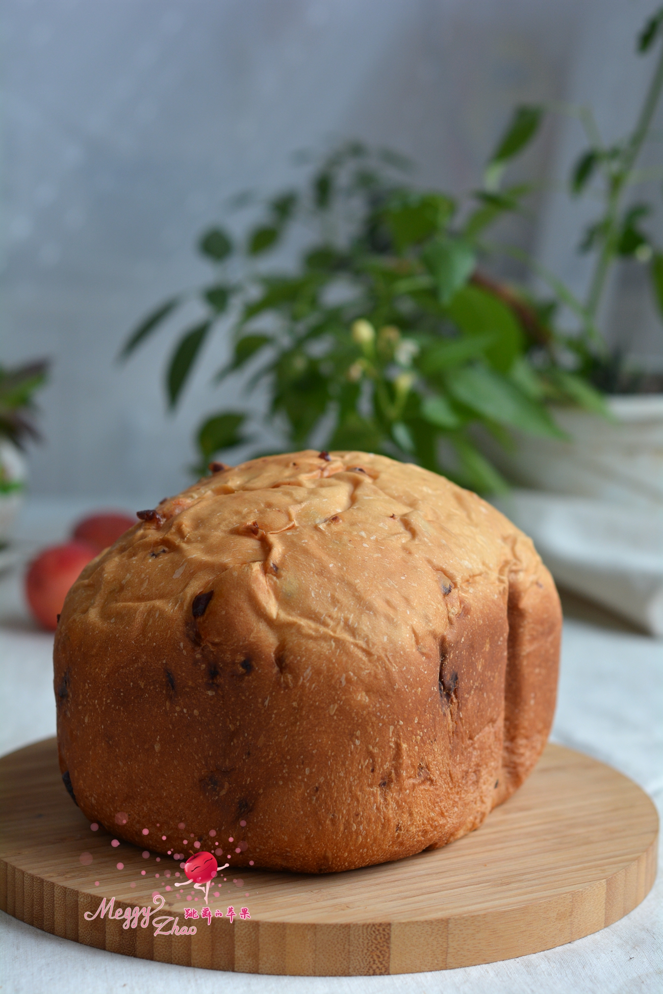 我时常用面包机做面包,省时省事,如果做为第二天的早餐,完全可以在睡觉前用面包机做个预约,一早起来就能吃上松软的大面包了。我今天的这个面包加了一些蔓越莓干,所以人工进行了一下干预;面包机的搅拌棒会让面包下面有个大洞,我也不喜欢,因此我也会把那个搅拌棒取出来。有果干果料在面包里,表面最好不要将这些露出来,会被烤糊,所以我通常都要把面团取出略微整理一下。